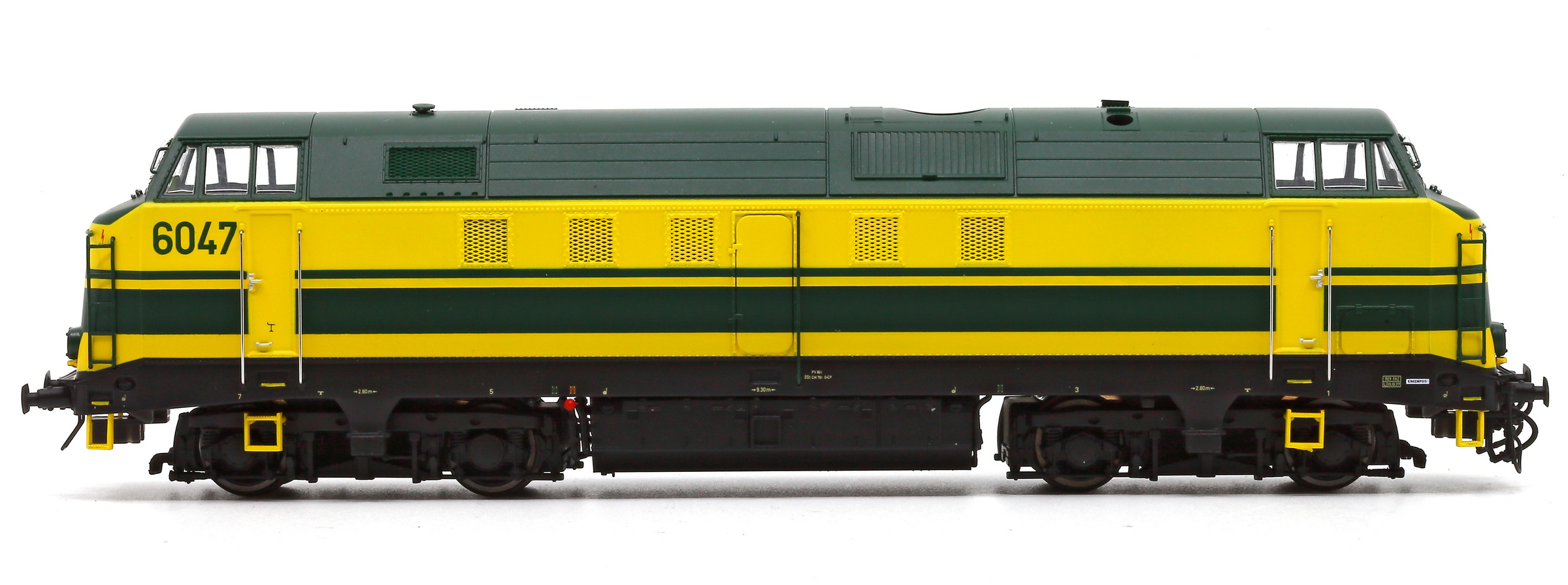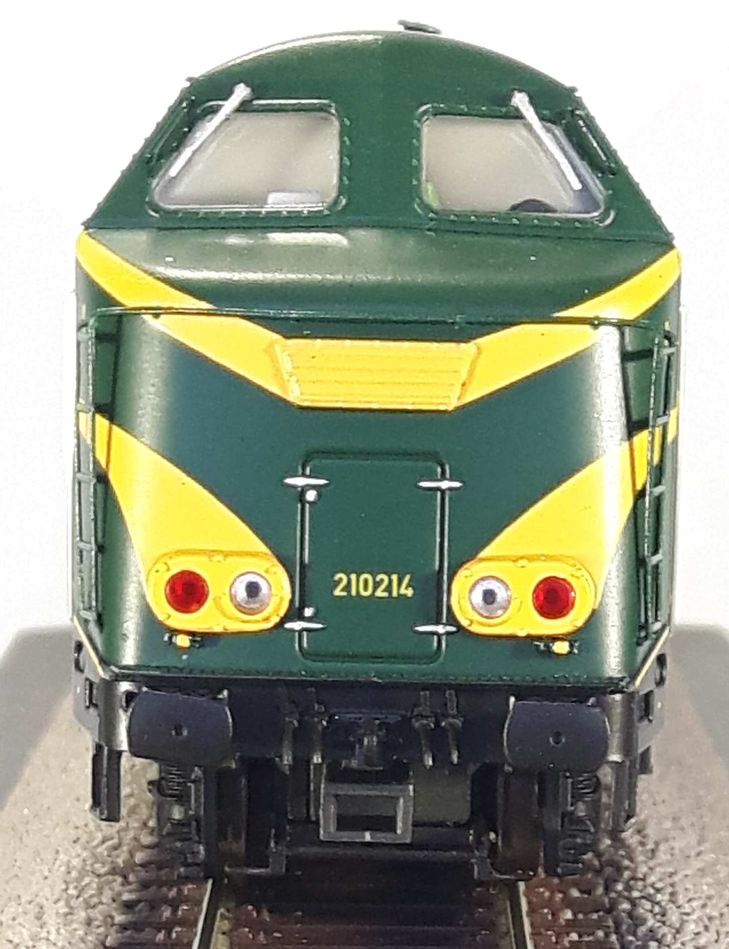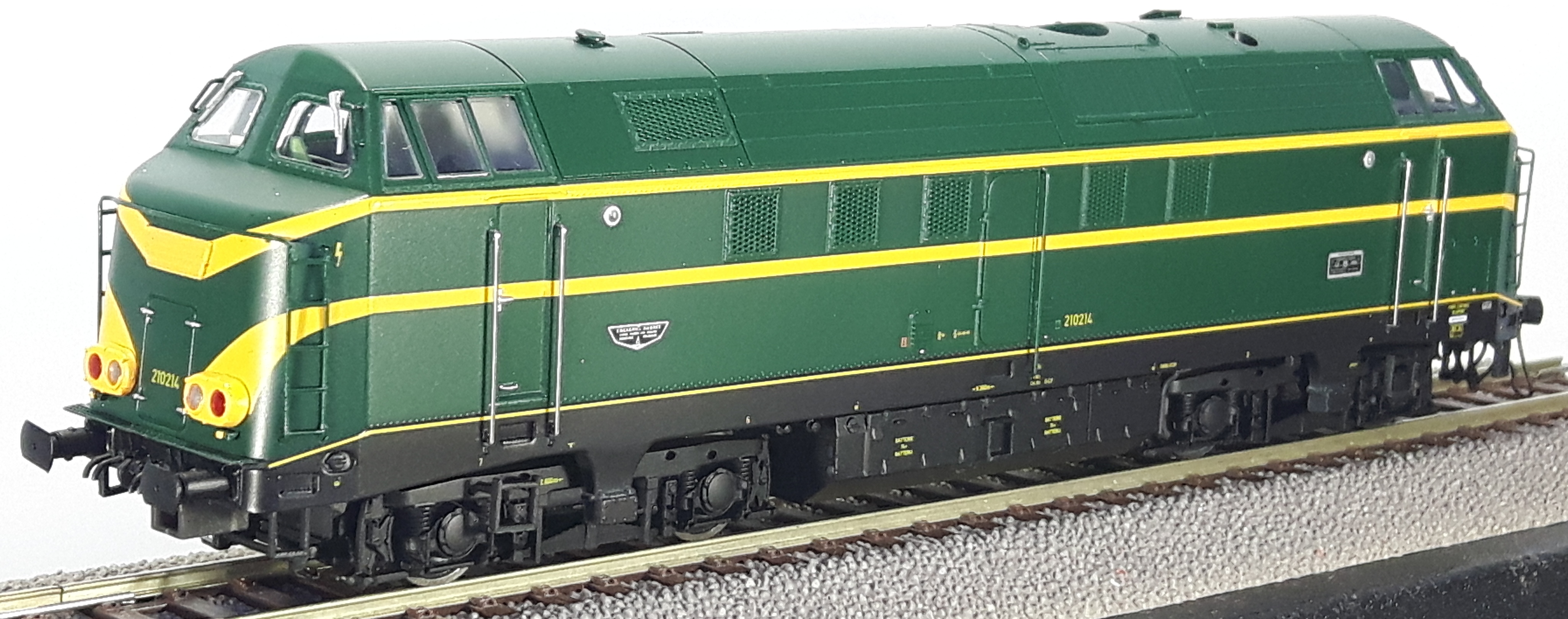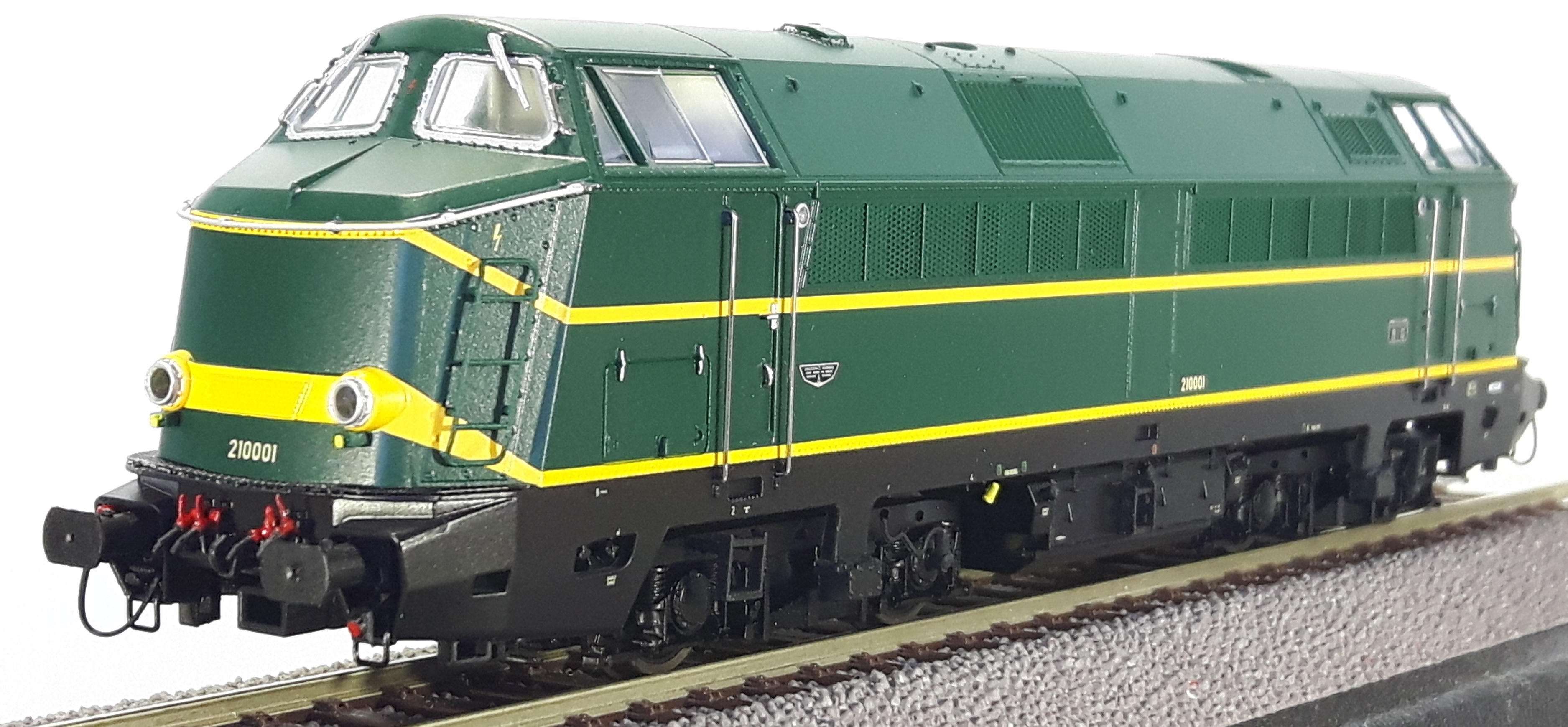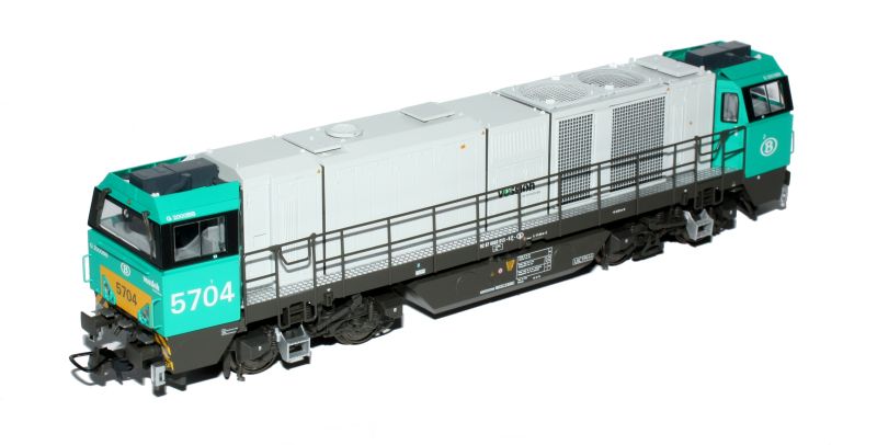 | | | 20.802 de 2011 = .5501, du dépôt de Schaerbeek, Locomotive diesel électrique de type Co'Co', livrée jaune avec un bandeau inférieur vert surmonté d'un ligne rouge, toit vert, marquage TVM en vert sous l'immatriculation latérale, Ep. V, DCC (upd 10/10/2025) |