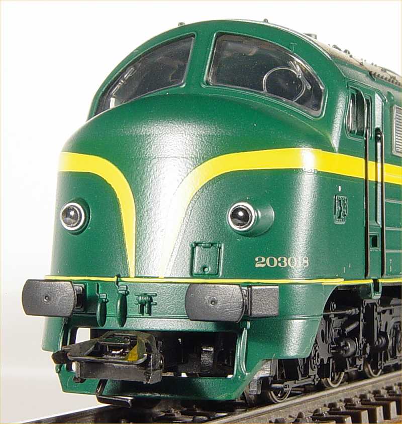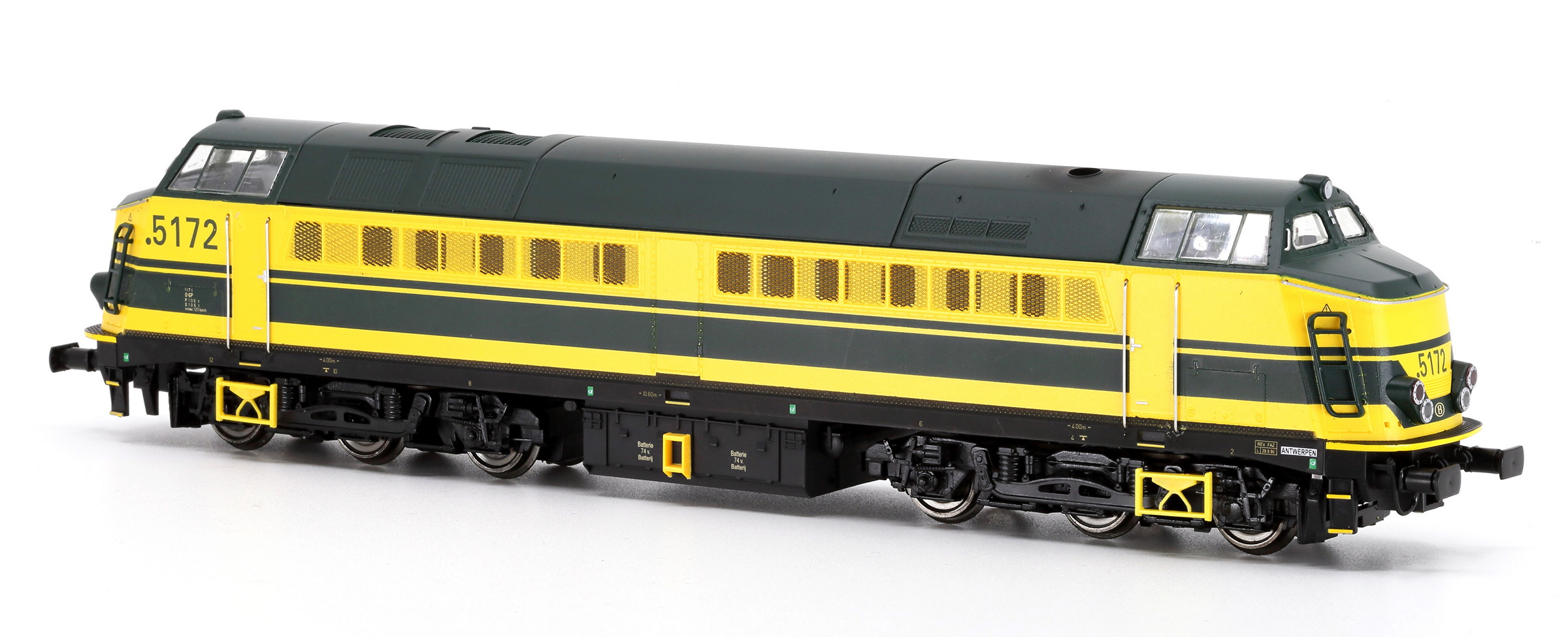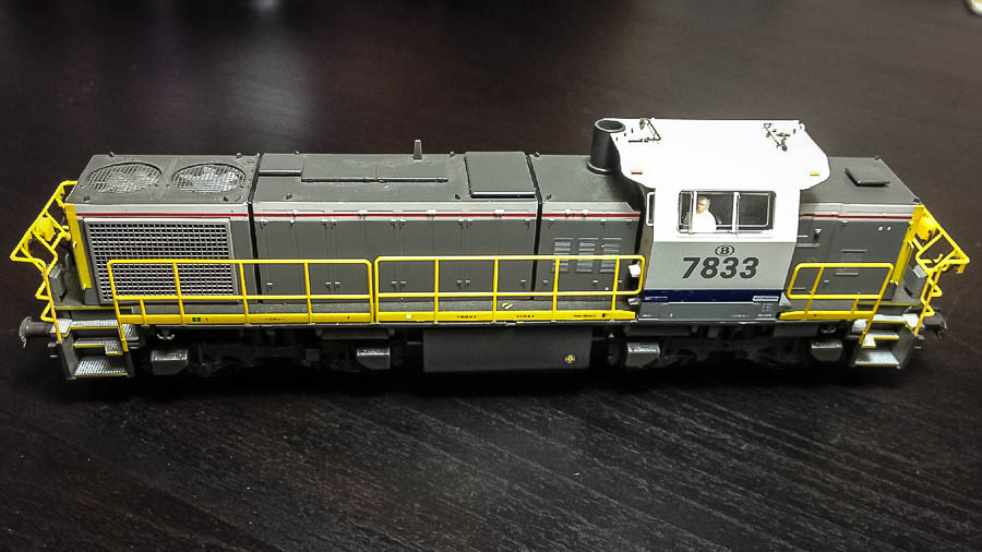 | | | T285 4896 = 7833, du dépôt de Antwerpen, Locomotive diesel hydraulique de type BB, livrée dite nouvelle livrée, grise, faces avant jaunes, ligne bleue au-dessus du châssis, Ep. V, 116 exemplaires, DCC, Sound (upd 26/06/2015) |