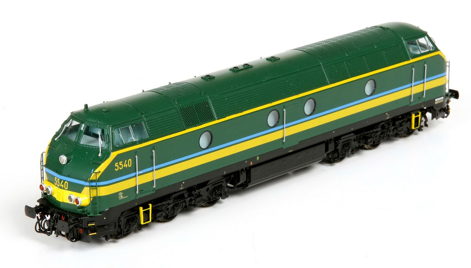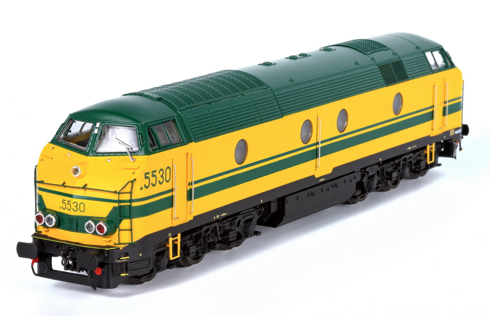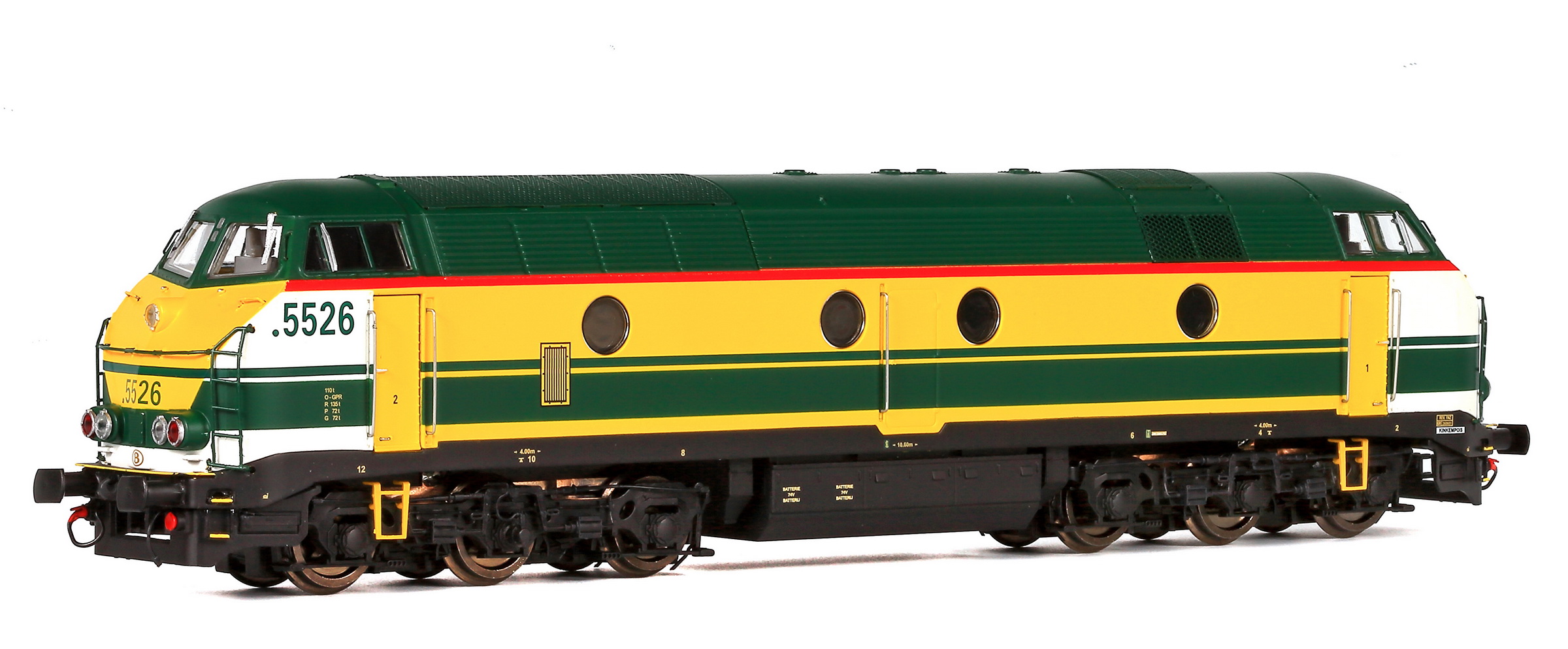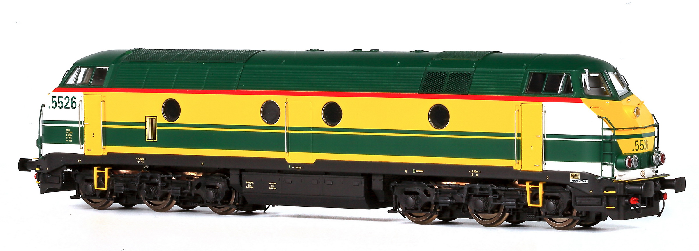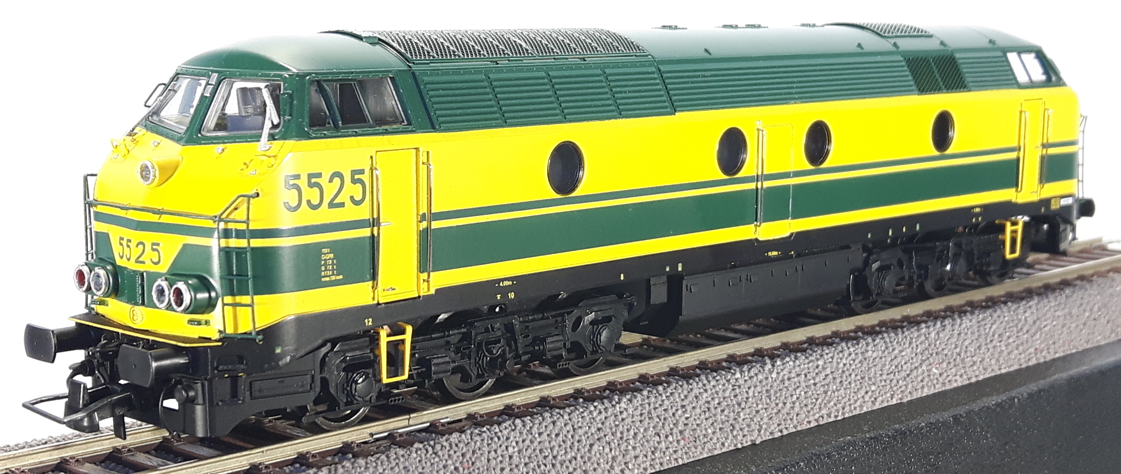 | | | 20.805 de 2011 = 5528, du dépôt de Kinkempois, Locomotive diesel électrique de type Co'Co', livrée jaune avec bandeau et bandes vertes, Ep. IV - V, DCC (upd 15/10/2019) |