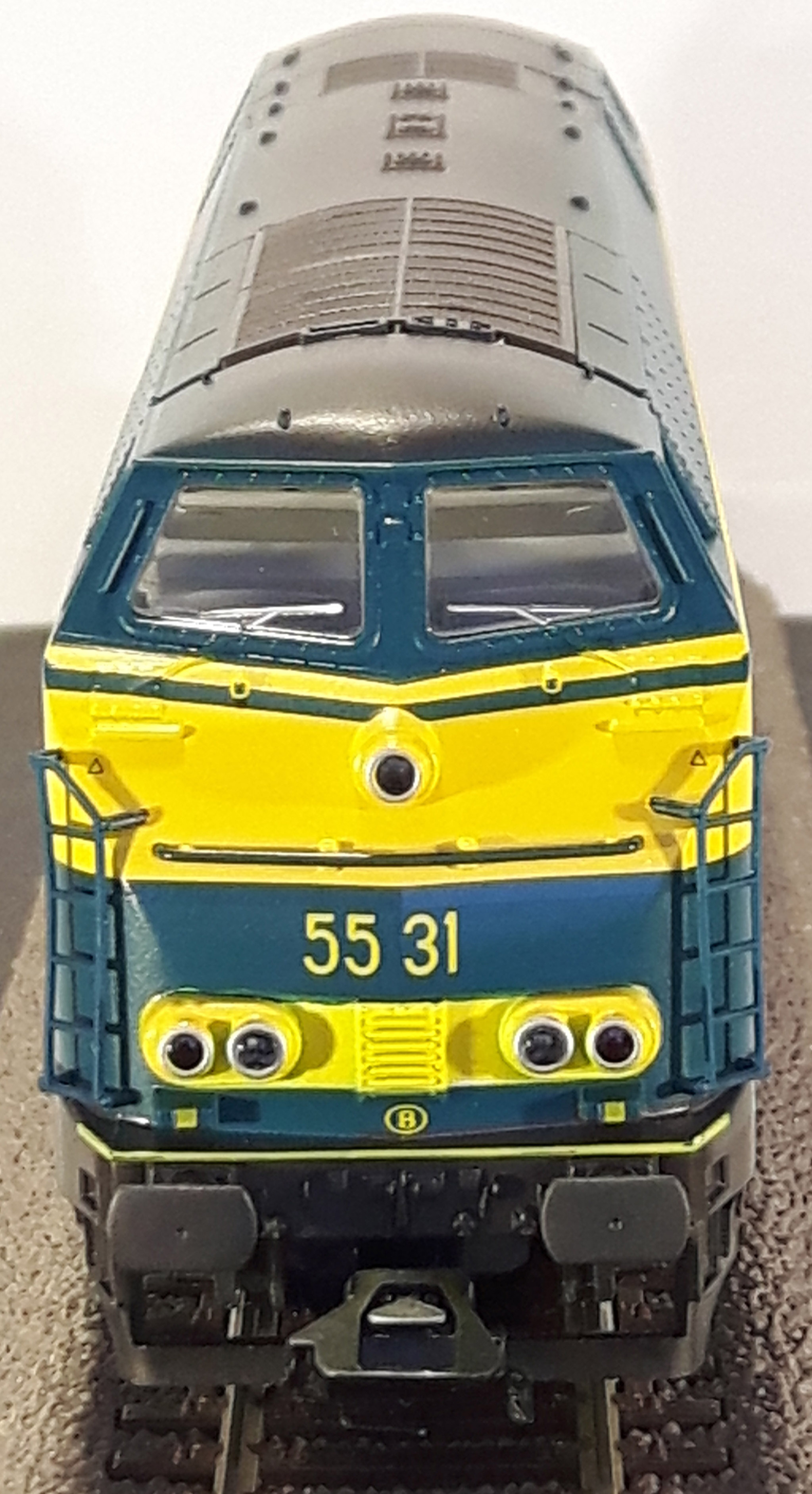 | | | T285 5555 = 7771, du dépôt de Antwerpen, Locomotive diesel hydraulique de type BB, livrée dite nouvelle livrée, grise, faces avant jaunes, ligne bleue au-dessus du châssis, Ep. V, AC, Digital Sound (upd 26/06/2015) |