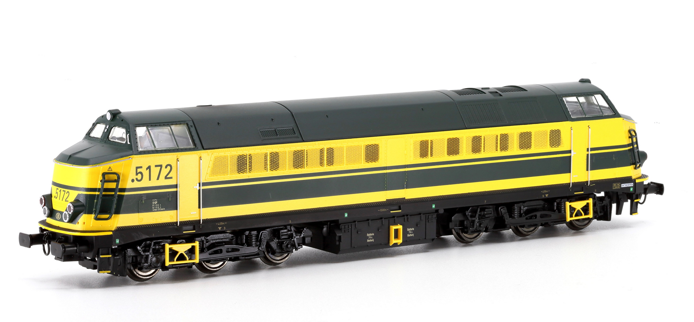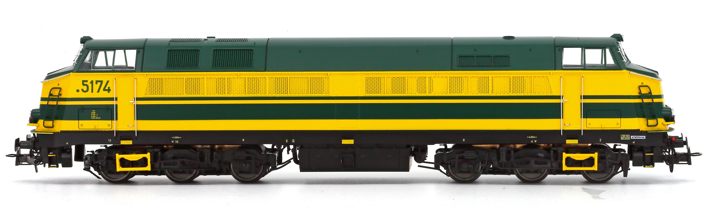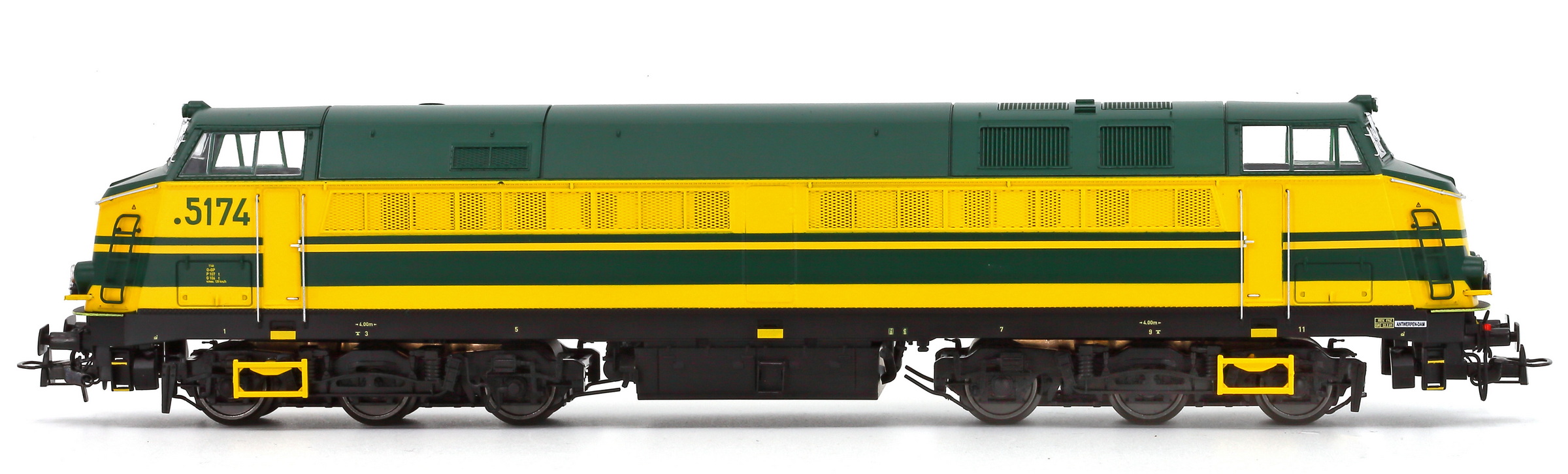 | | | VB-3607-04 de 2025 = 5174, du dépôt de Antwerpen-Dam, Locomotive diesel électrique de type Co'Co', châssis noir, livrée jaune, 5 phares, point devant le numéro, logo B, Ep. IV, AC Digital (upd 24/11/2025) |