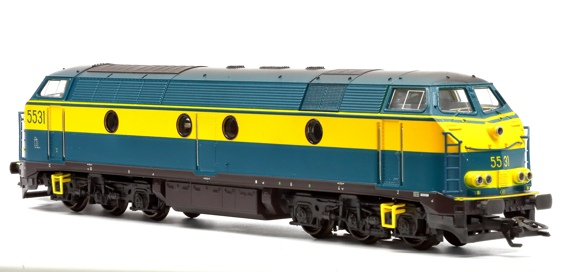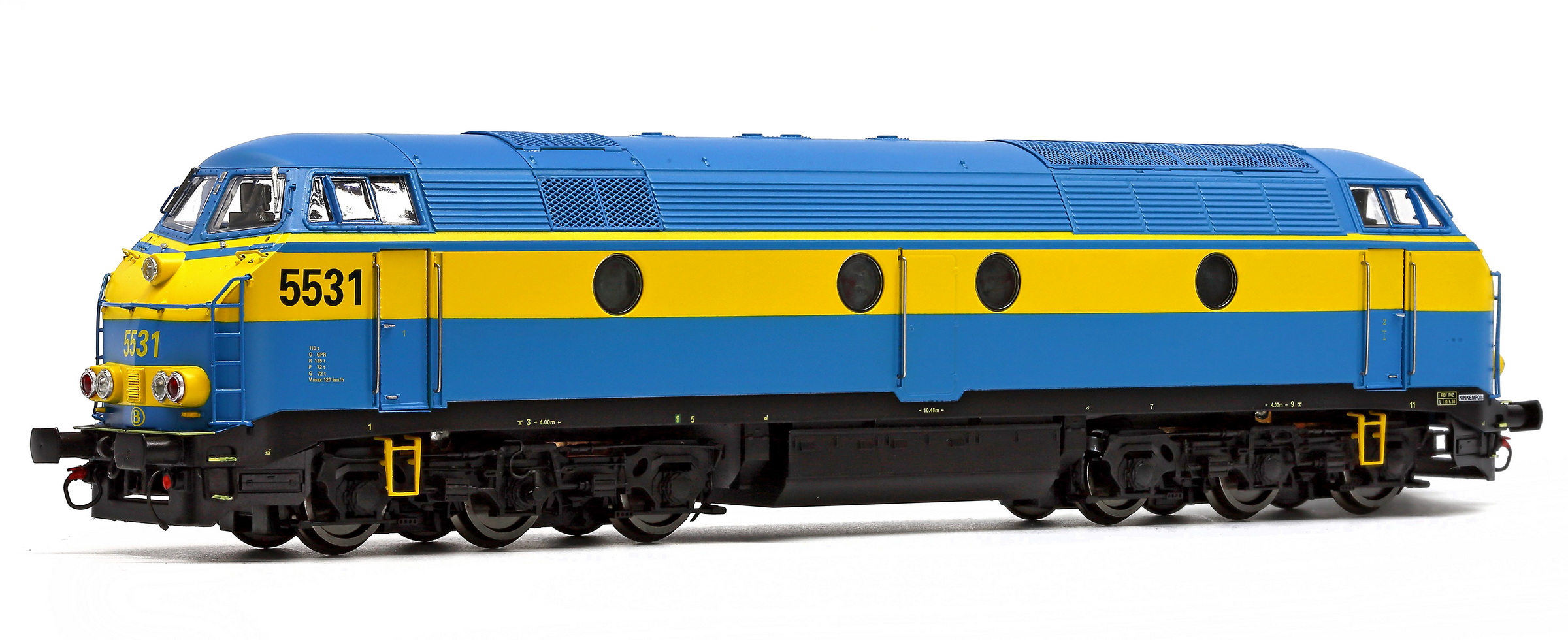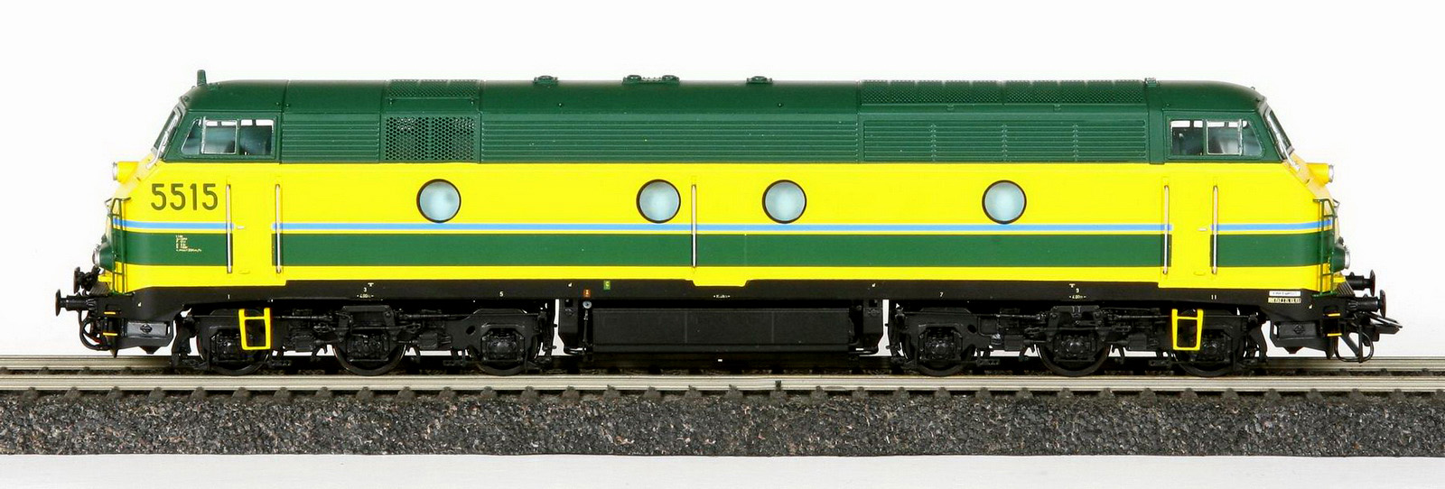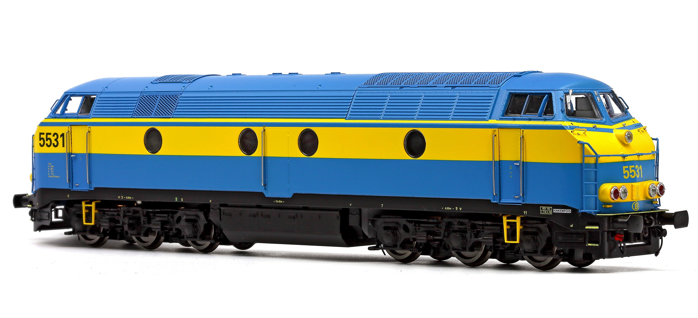 | | | 20.800 de 2010 = 5515, du dépôt de Kinkempois, Locomotive diesel électrique de type Co'Co', châssis noir, livrée bleue-jaune, auto-collant magelan, Ep. V, DCC (upd 13/08/2016) |