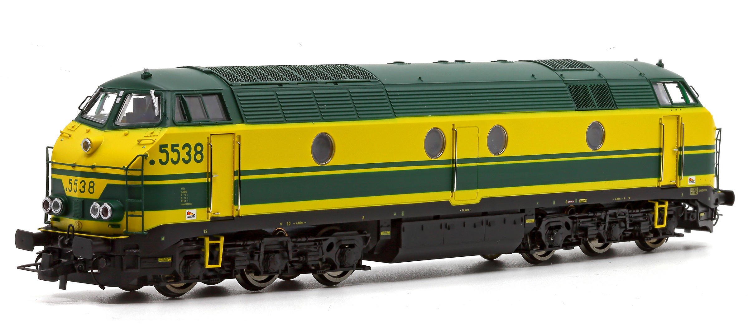 | | | 20.107 de 2011 = 5538, du dépôt de Kinkempois, Locomotive diesel électrique de type Co'Co', livrée jaune avec un bandeau inférieur vert surmonté d'un ligne verte, toit vert, Ep. IV - V, DC (upd 10/10/2025) |