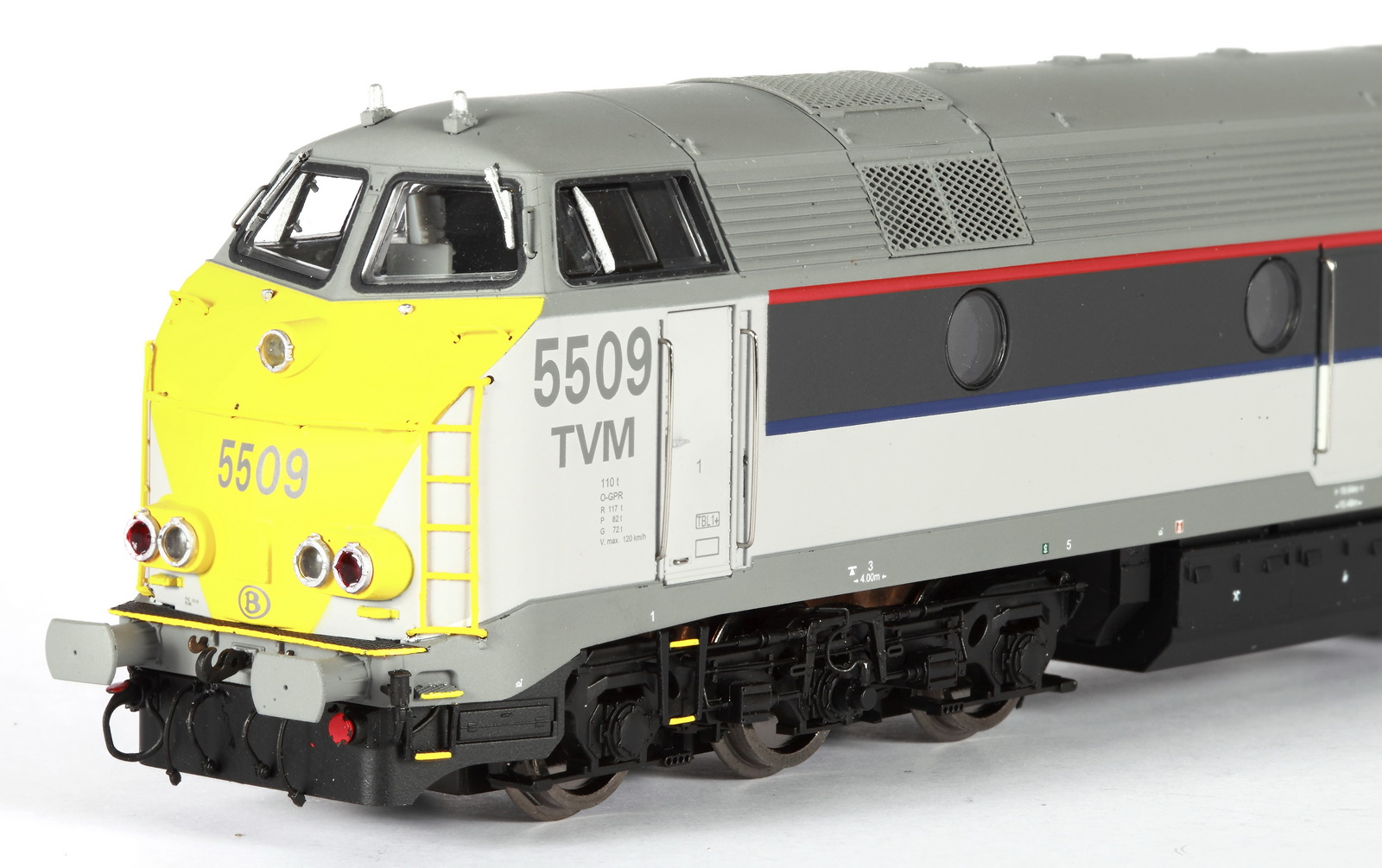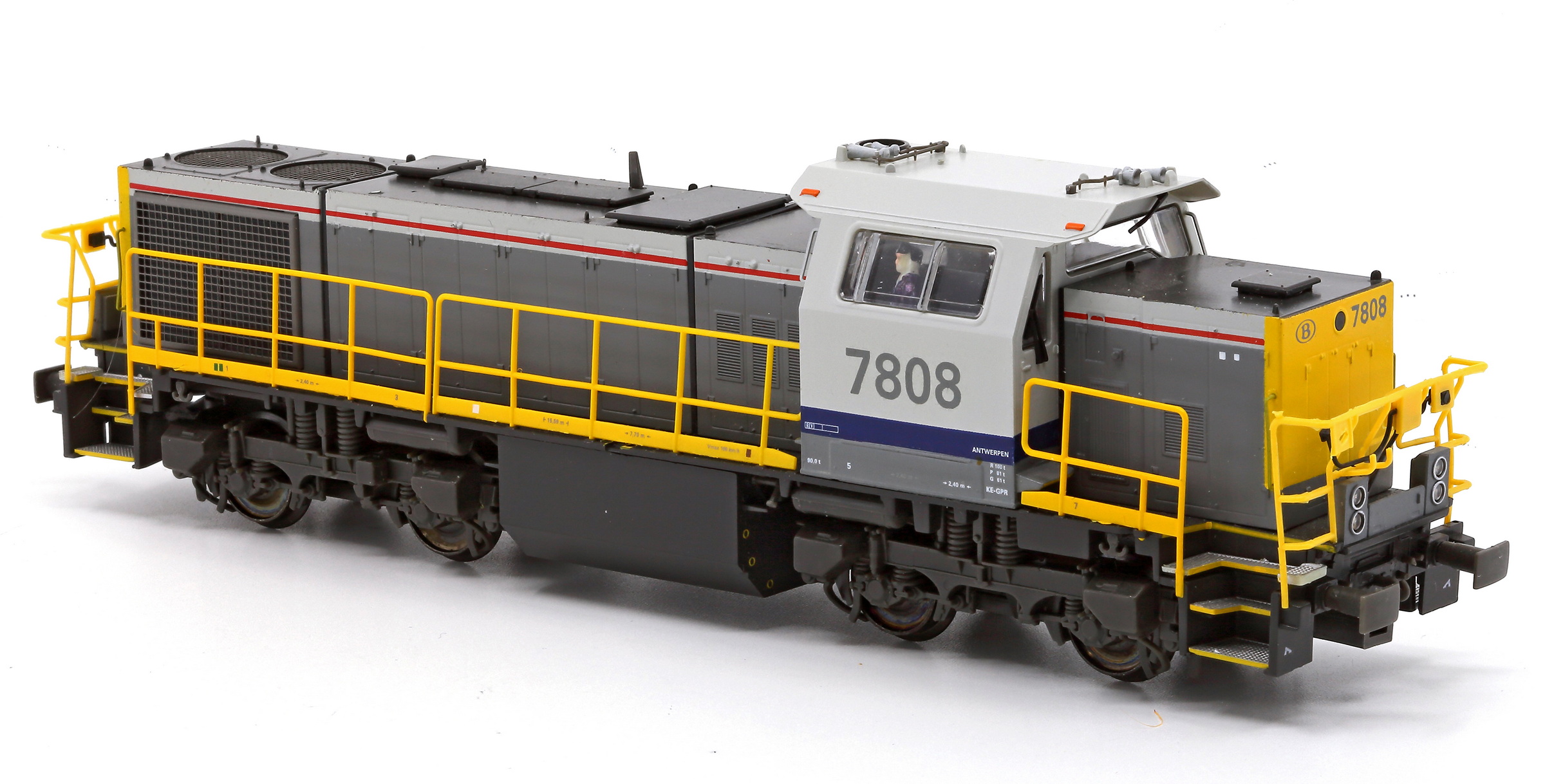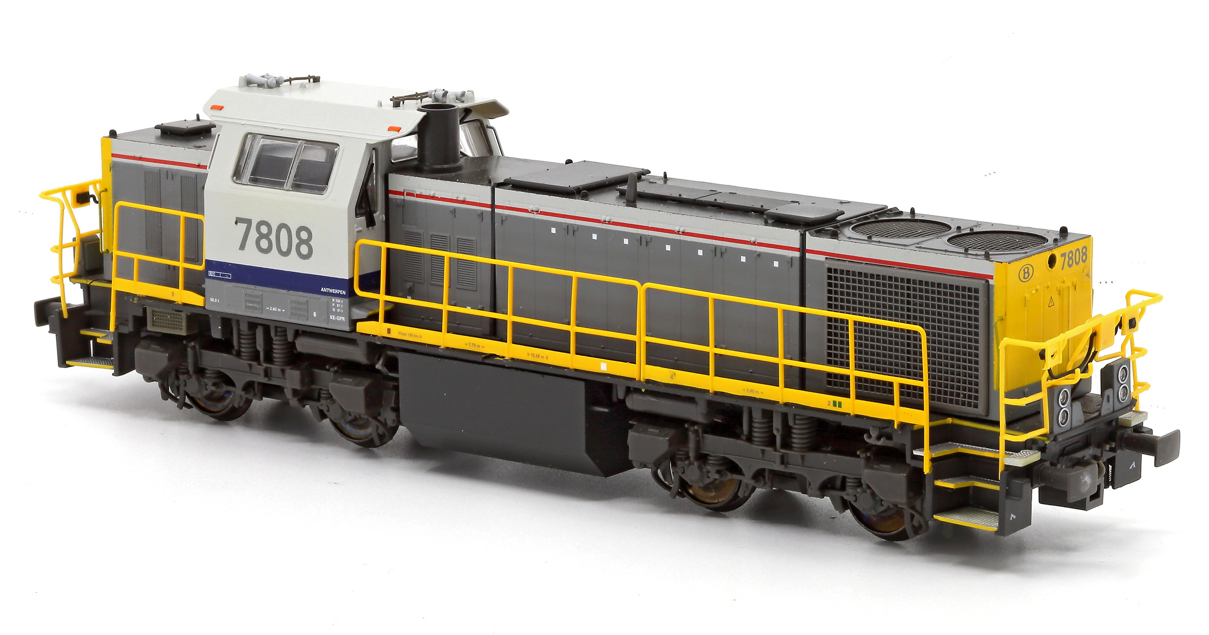 | | | T285 de 2004 = 7808, du dépôt de Antwerpen, Locomotive diesel hydraulique de type BB, livrée dite nouvelle livrée, grise, faces avant jaunes, ligne bleue au-dessus du châssis, Ep. V, série spéciale de Van Biervliet, 300 exemplaires, AC, Digital Sound (upd 10/06/2025) |