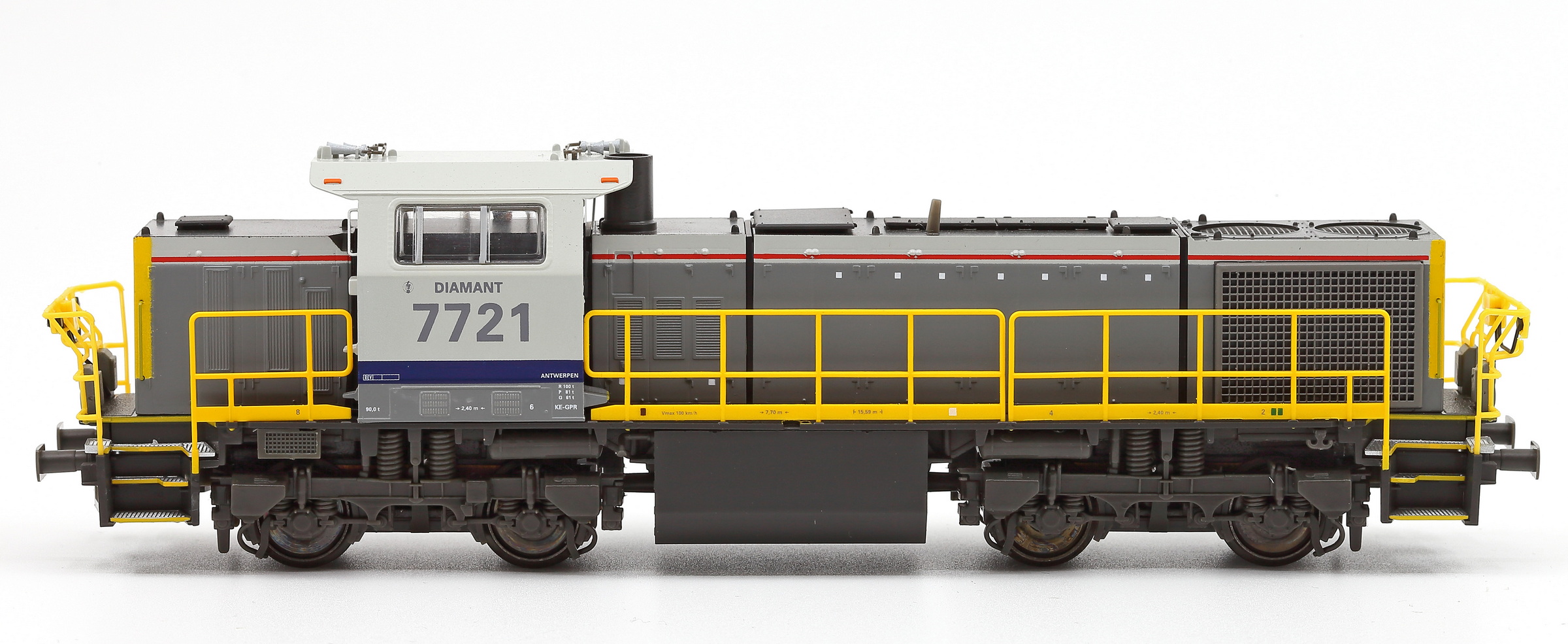 | | | T285 4889 = 7721 DIAMANT, du dépôt de Antwerpen, Locomotive diesel hydraulique de type BB, livrée dite nouvelle livrée, grise, faces avant jaunes, ligne bleue au-dessus du châssis, Ep. V, 101 exemplaires, AC, Digital Sound (upd 01/06/2024) |