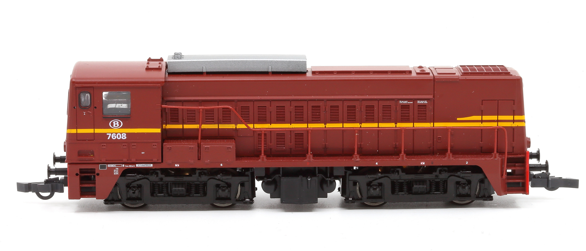 | | | T285 4890 = 7804, du dépôt de Merelbeke, Locomotive diesel hydraulique de type BB, livrée dite nouvelle livrée, grise, faces avant jaunes, ligne bleue au-dessus du châssis, Ep. V, 101 exemplaires, DC (upd 01/06/2024) |