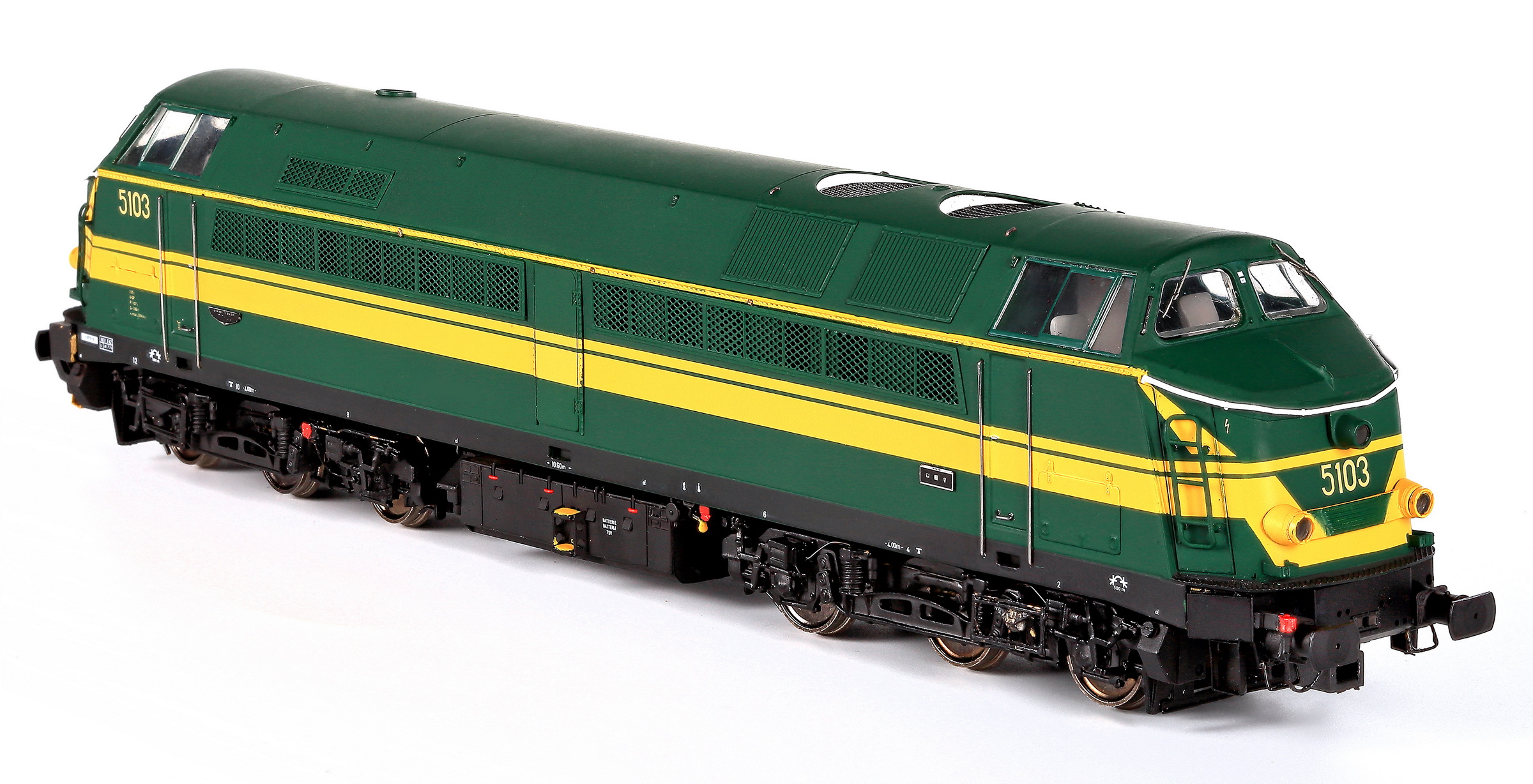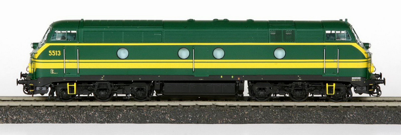 | | | VB-3606-05 de 2025 = 5191, du dépôt de Kortrijk, Locomotive diesel électrique de type Co'Co', châssis noir, livrée verte 1970, 5 phares, phare supérieur occulté, plaques constructeur, Ep. IV, AC Digital Sound (upd 10/10/2025) |