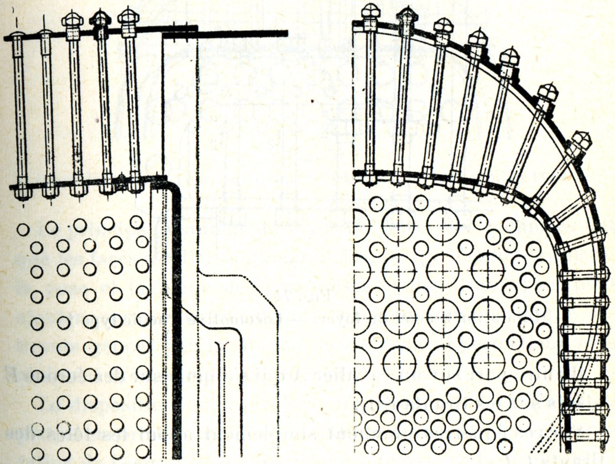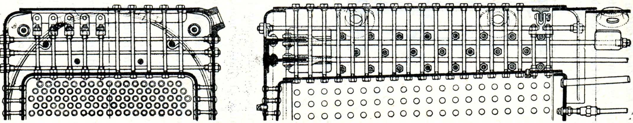 Les deux parois littérales, la paroi d'arrière et la partie inférieure de la tôle tubulaire sont rattachées à l'enveloppe extérieure (ou boîte à feu) par des entretoises. Les entretoises sont des barres de cuivre ou d'acier filetées soit sur toute leur longueur, soit seulement aux extrémités (fig. 54, système adopté en Belgique) et qui s'introduisent dans des trous taraudés à travers les deux tôles. Souvent aussi, les entretoises sont amincies entre les parties filetées (fig. 54) ; ainsi délardées, elles sont un peu plus flexibles et les incrustations s'attachent moins facilement à la partie lisse.
