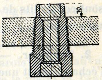 Les entretoises sont mises en place au moyen d'un écrou borgne dans lequel elles sont préalablement vissées ; l'écrou est pourvu à son extrémité d'une portée carrée permettant l'application d'un tourne à gauche. Les extrémités de l’entretoise dépassent les tôles de la quantité nécessaire à la formation des têtes ; les têtes sont façonnées au petit marteau de façon à leur donner la forme indiquée (fig. 54).