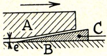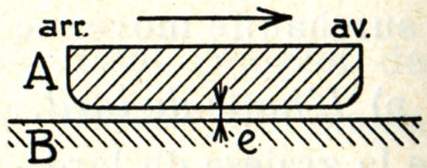 B) Frottement fluide (ou hydrodynamique). - Lorsque le graissage est parfait, la couche d'huile, quoique très mince, n'est à aucun endroit interrompue et sépare d'une manière permanente les surfaces métalliques sur toute leur étendue. Il s'ensuit que l'usure de ces surfaces est extrêmement faible ; théoriquement, elle est nulle.