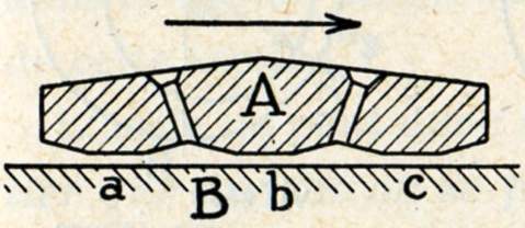 A) Frottement sec. - En l'absence de tout graissage, il y a frottement direct des métaux l'un sur l'autre, c'est un frottement sec. Il donne lieu à une forte usure et il y a danger de grippement au cours duquel les deux surfaces métalliques mordent l'une sur l'autre.