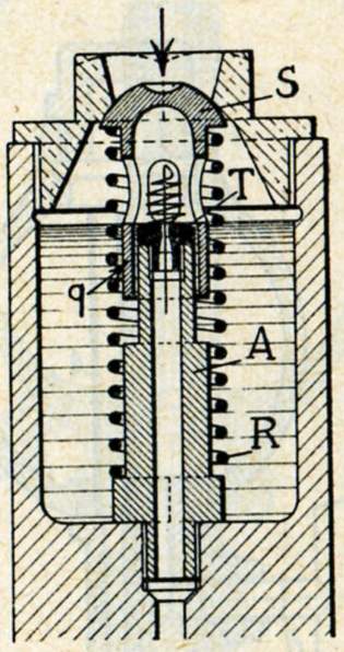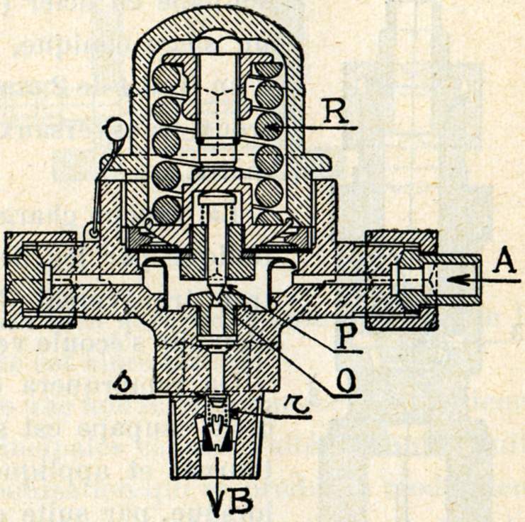 Sous la pression de l'huile, le ressort R se comprime, le diaphragme se soulève, entraîne le pointeau qui démasque l'ouverture 0 du départ vers B. L'huile sous pression repousse la soupape s et sort par B.