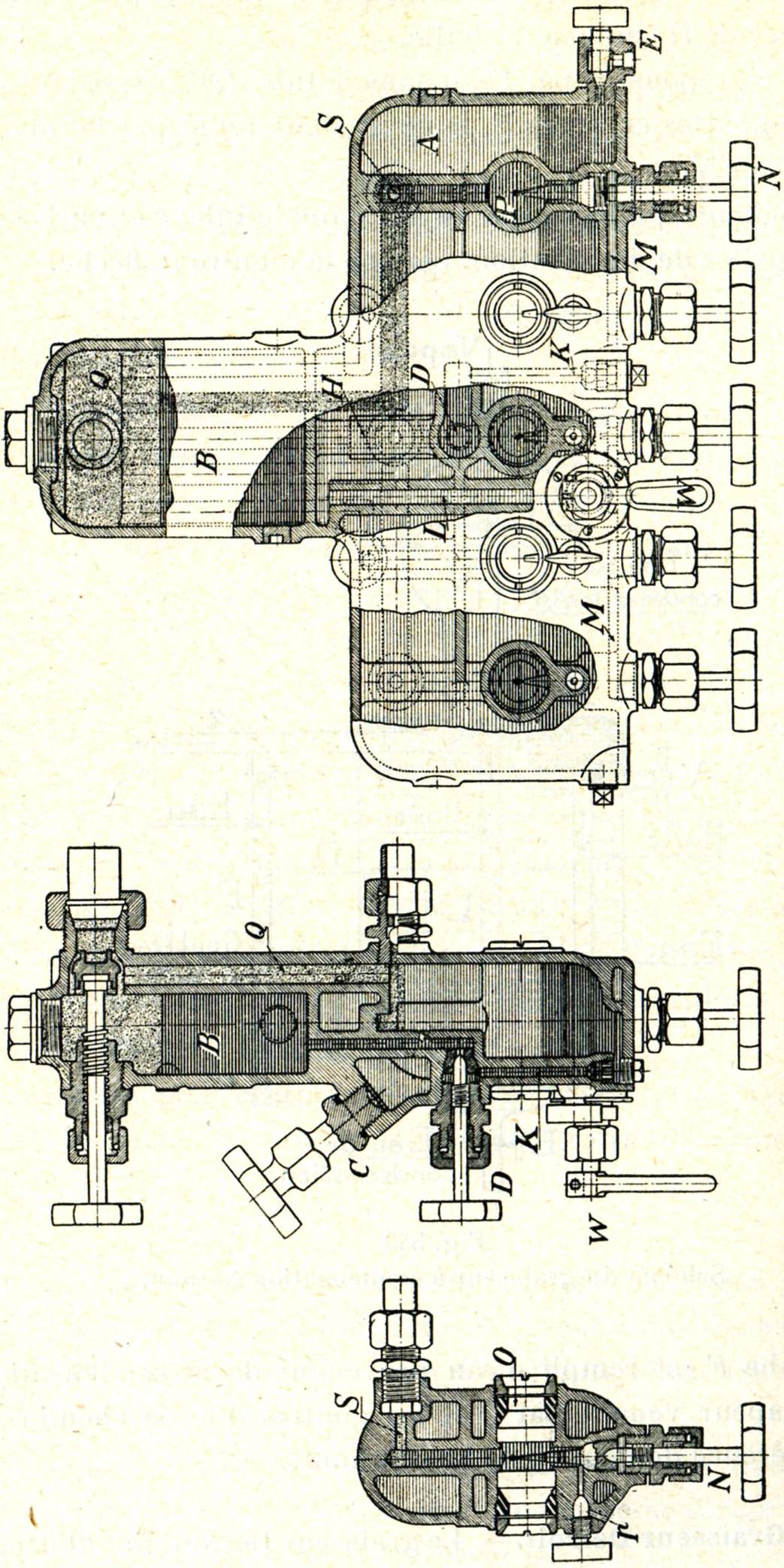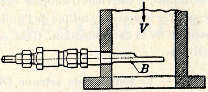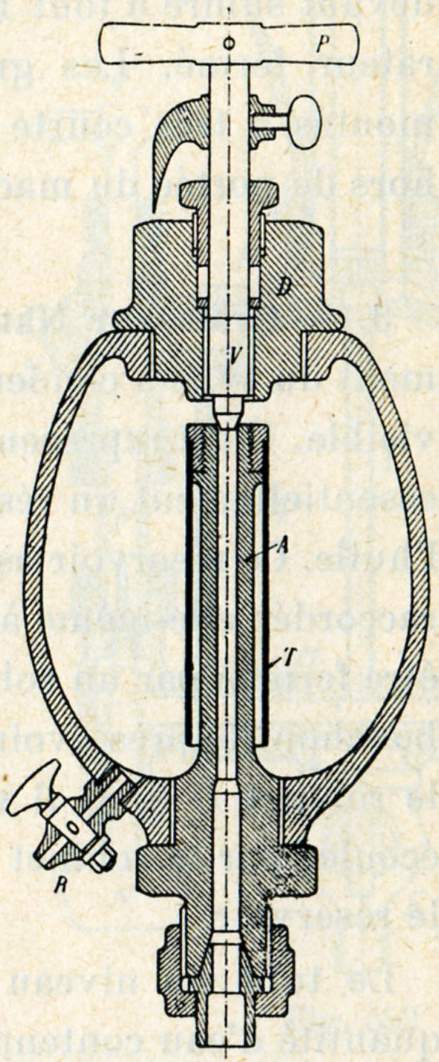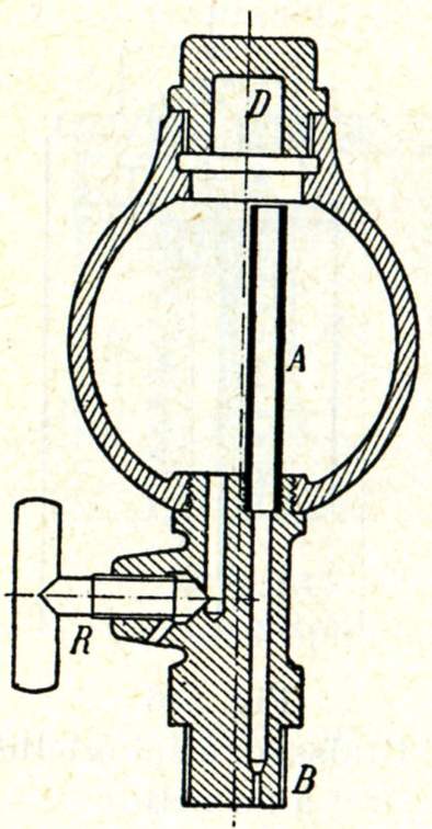 Avant d'introduire l'huile, il faut s'assurer que la prise de vapeur est bien fermée. Quand le bouchon D est dévissé, on laisse écouler l'eau de condensation par le robinet R.