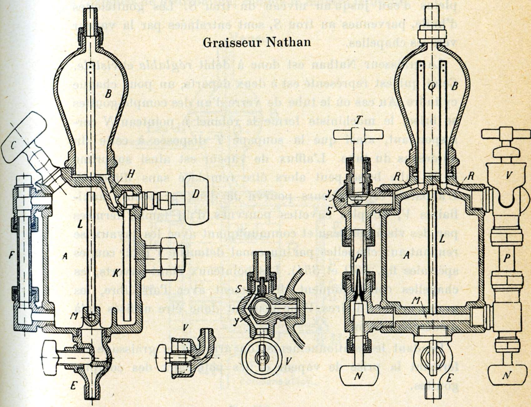 Le graisseur Nathan est donc à débit réglable et visible. Celui qui est représenté est à deux départs, un pour chaque cylindre. Au cas où le tube de verre d'un des compte-gouttes se brise, le machiniste ferme le robinet à pointeau N correspondant, ainsi que la soupape T disposée à cette fin au-dessus du tube. L'afflux de vapeur est ainsi supprimé et le tube brisé peut alors être remplacé sans difficulté. L'appareil est d'ailleurs pourvu de deux graisseurs auxiliaires V, simples cuvettes pourvues d'un tamis, fermées par des vis à pointeau et communiquant avec les tuyaux se rendant aux chapelles par un canal détourné Y (voir coupes spéciales fig. 550 et 551). Les pointeaux étant ouverts, les chapelles communiquent directement avec l'air libre, les graisseurs auxiliaires V ne peuvent donc être utilisés qu'à modérateur fermé.
