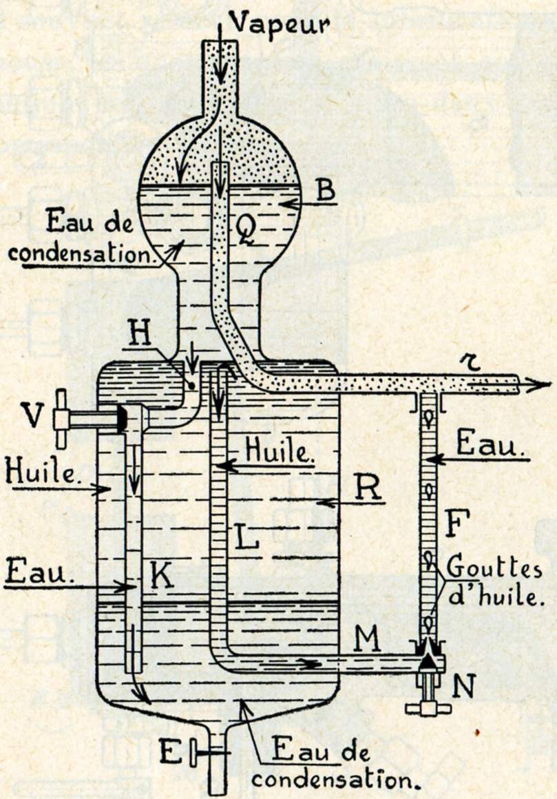 Le tube F est rempli d'eau provenant de la condensation de la vapeur venant par Q et les gouttes d'huile cheminent par différence de densité de bas en haut.