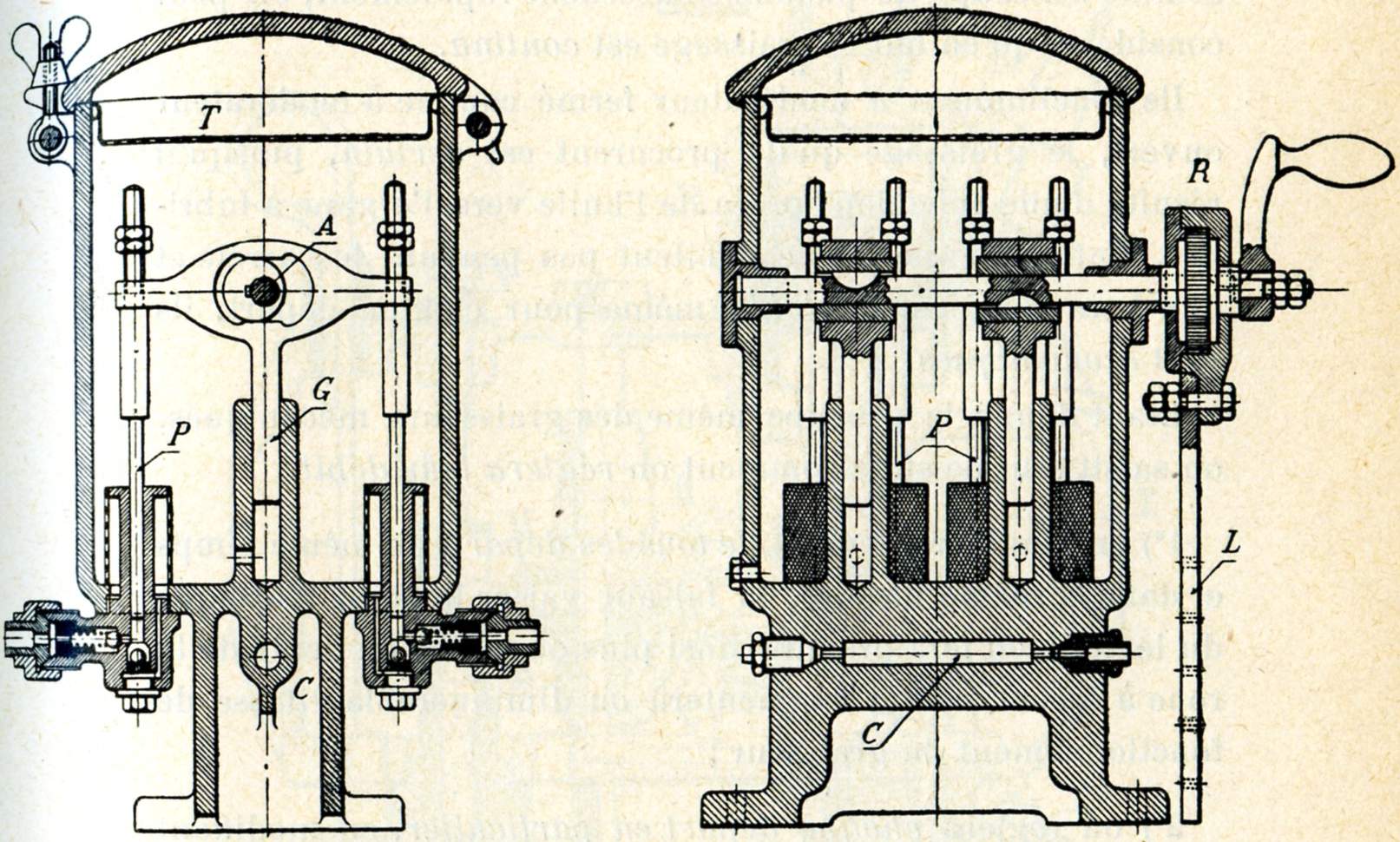 Comme le montre la fig. 558, la levée et l'abaissement des pistons P sont obtenus par la rotation d'un excentrique calé sur l'arbre A dans une coulisse guidée inférieurement en G. La course verticale de la coulisse est constante, mais cette course ne se communique pas dans son entièreté aux pistons P, en raison du jeu qui existe entre les tiges de commande des pistons et les portées d'entraînement correspondantes de la coulisse. Ce jeu peut d'ailleurs être réglé depuis zéro jusqu'une certaine valeur maximum, suivant la position donnée à l'écrou et au contre-écrou que l'on distingue sur la figure.
