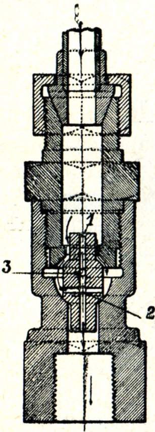 Nous avons vu que l'huile livrée par les graisseurs à condensation est emportée, au départ du graisseur, par un courant de vapeur se dirigeant, par exemple, vers une chapelle de distribution. Afin de régulariser ce courant tout en soustrayant la capacité intérieure B (fig. 549, 532, 553, 555, 556) du graisseur aux variations de pression importantes qui se produisent dans les chapelles, le jet de vapeur chargé d'huile est obligé de traverser un orifice de petit diamètre ou diaphragme situé en S dans le graisseur Nathan (fig. 551). Dans le graisseur Détroit, la pièce formant diaphragme est placée à proximité de l'endroit à graisser ; elle comporte une soupape en acier (fig. 564) appliquée sur un siège conique, forée suivant son axe d'un trou 1 de 2 mm de diamètre et de deux trous transversaux 2 et 3 de même diamètre.