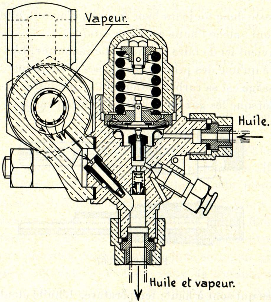 La vapeur affluant en V des tuyaux de livrance vers les chapelles est animée d'une grande vitesse, ce qui permet en raison de la forme spéciale donnée à l'extrémité de la broche d'introduction de l'huile, d'amener celle-ci à un état de division extrême, de la pulvériser en quelque sorte.