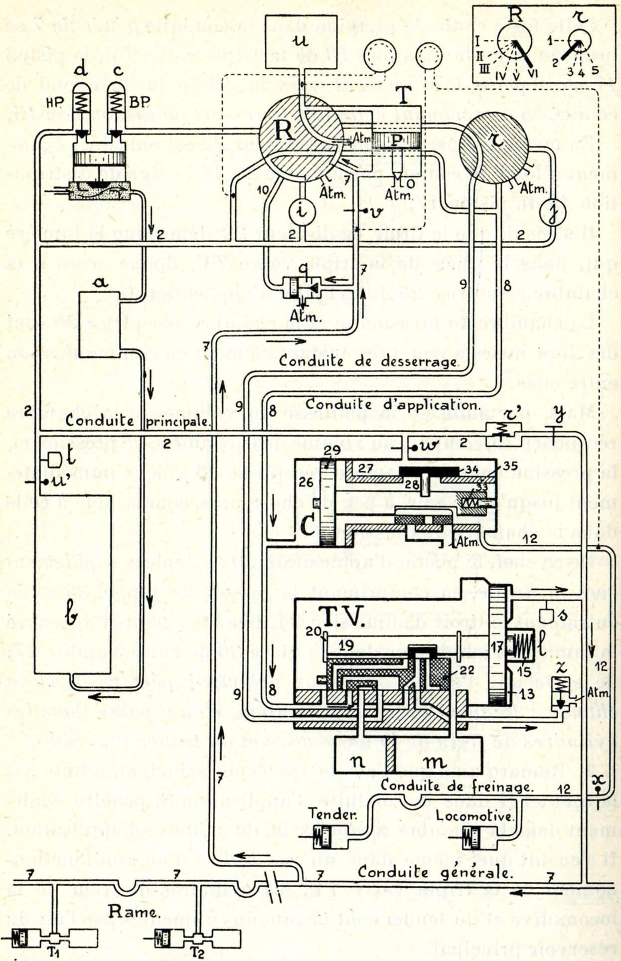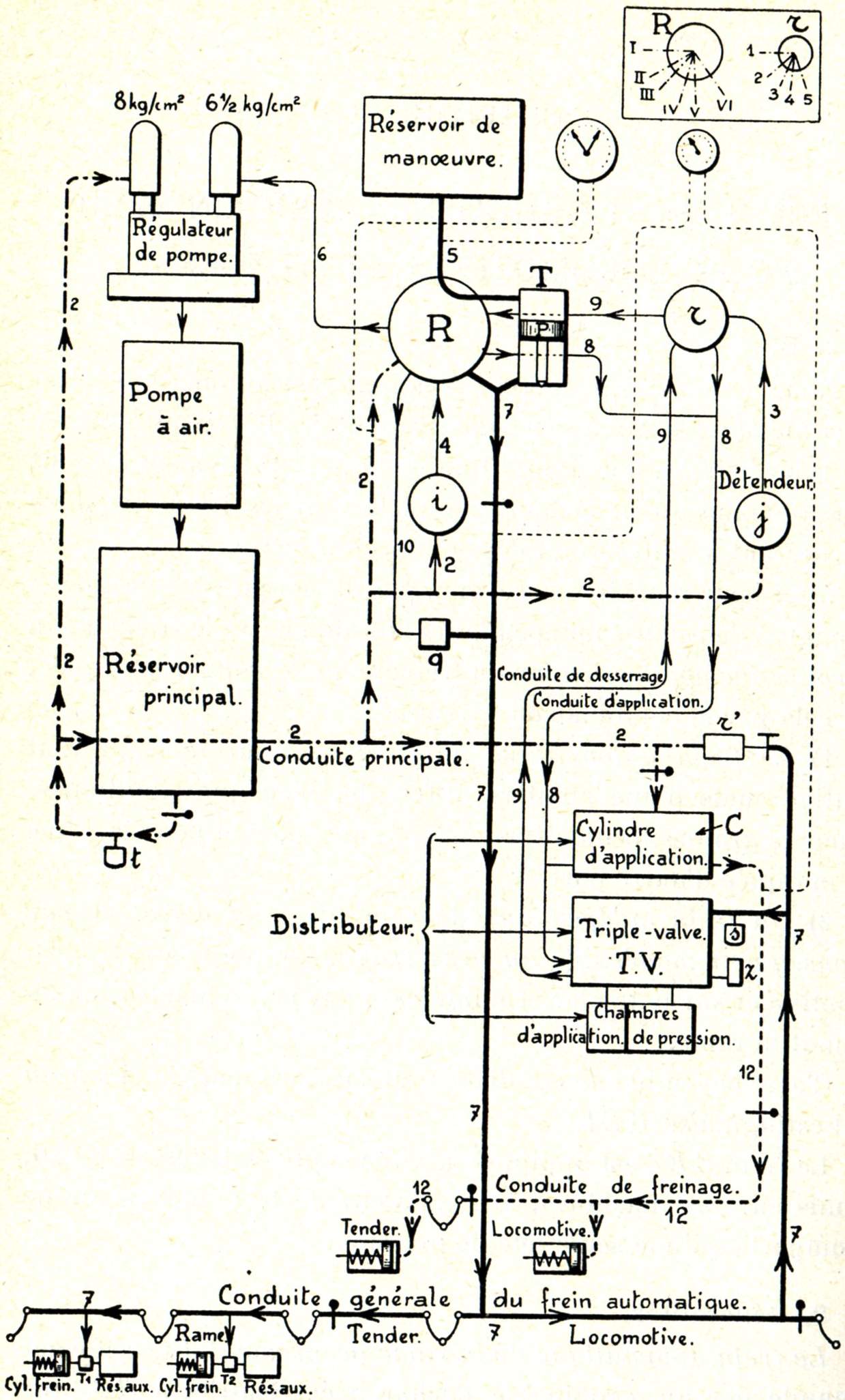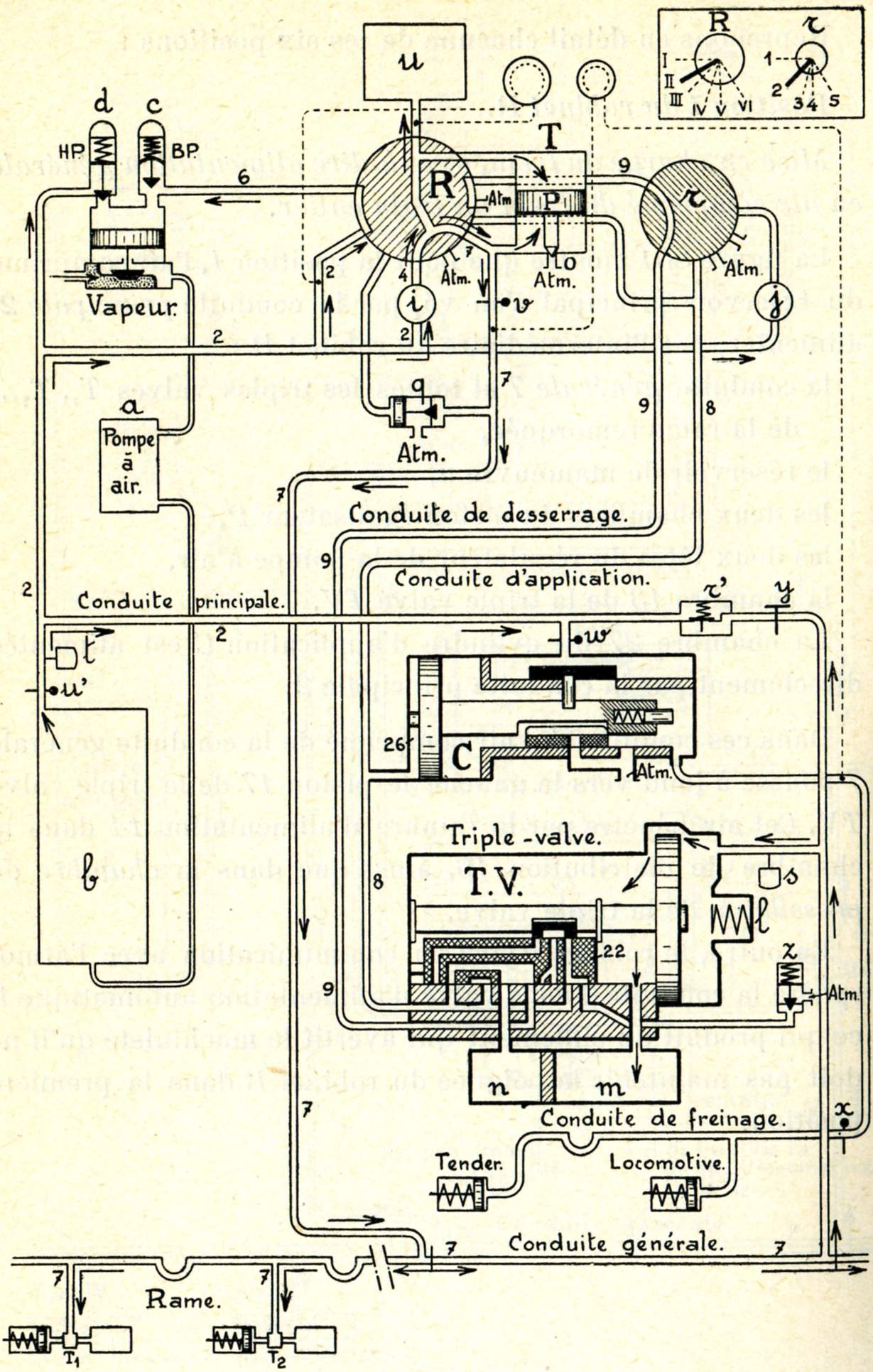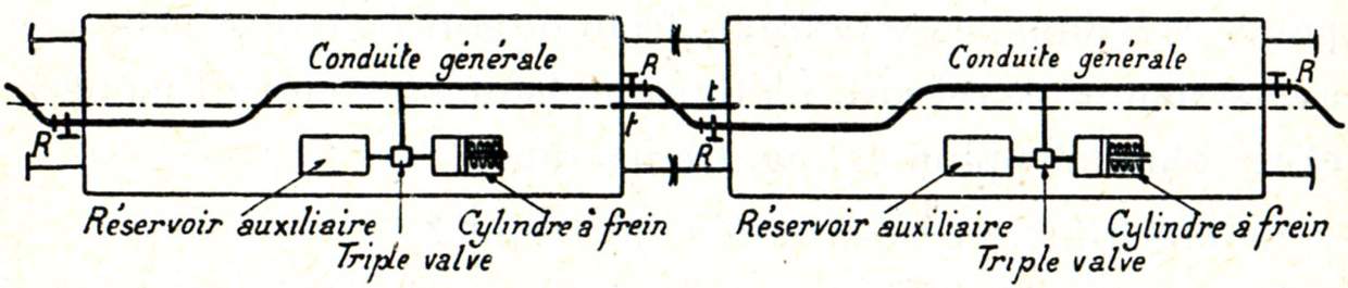 La locomotive porte (fig. 749) une petite pompe à vapeur, appelée compresseur, dénommée communément pompe à air. Cette pompe aspire l'air à l'extérieur et le refoule, en le comprimant à une pression de 8 kg/cm², dans un réservoir placé aussi sur la locomotive et dénommé réservoir principal. Le réservoir principal communique à son tour avec une conduite qui règne sur toute la longueur du train et que l'on nomme pour ce motif conduite générale. Enfin, sous chaque véhicule se trouvent installés : un cylindre appelé cylindre de frein, un petit réservoir dénommé réservoir auxiliaire et un appareil distributeur qui a reçu le nom de triple valve.