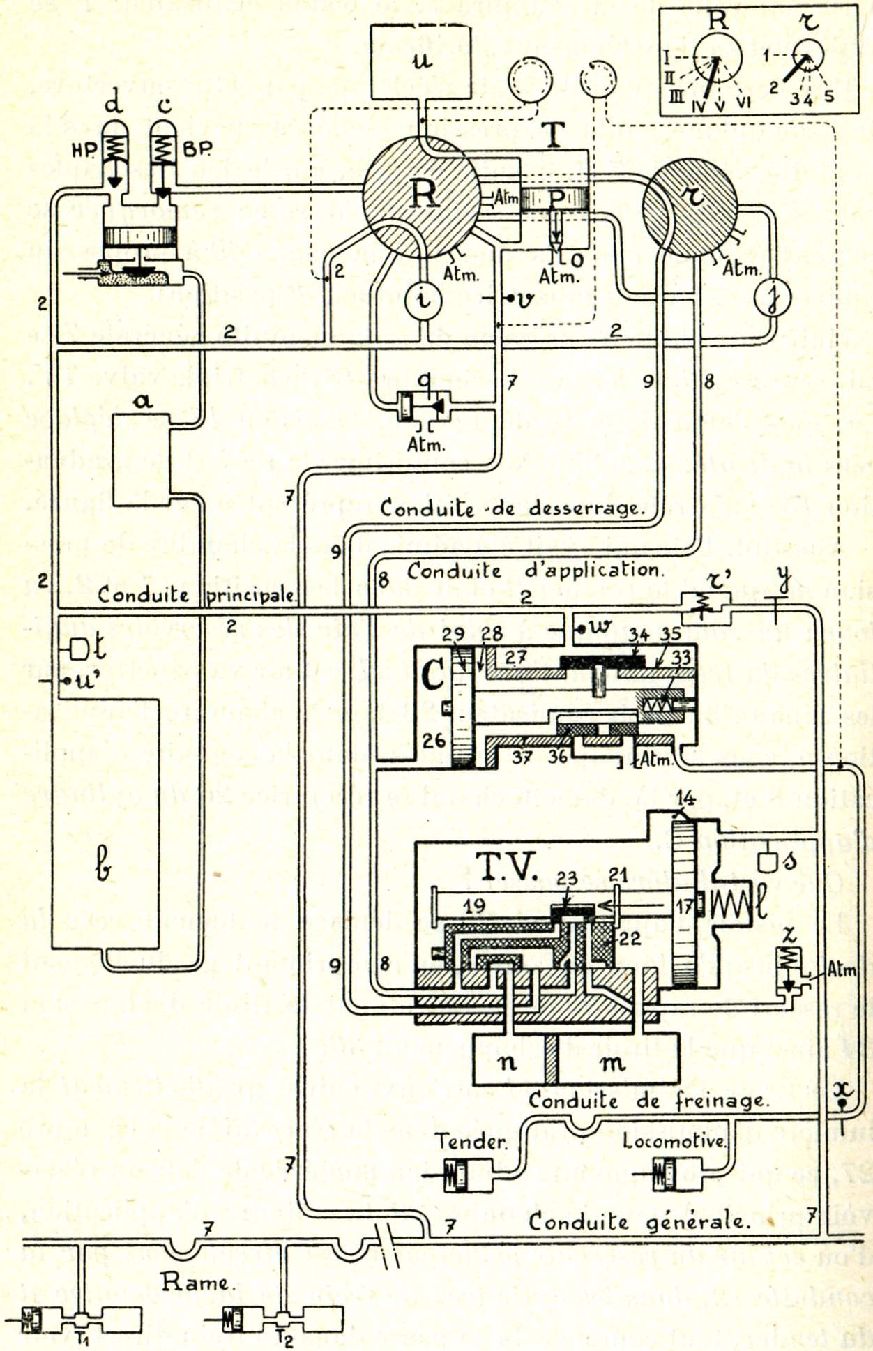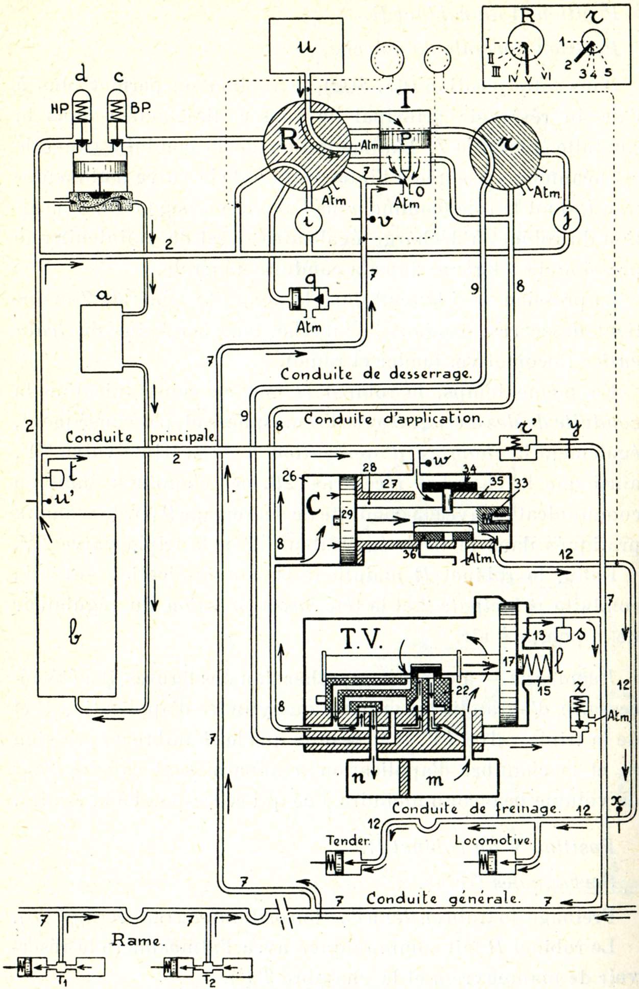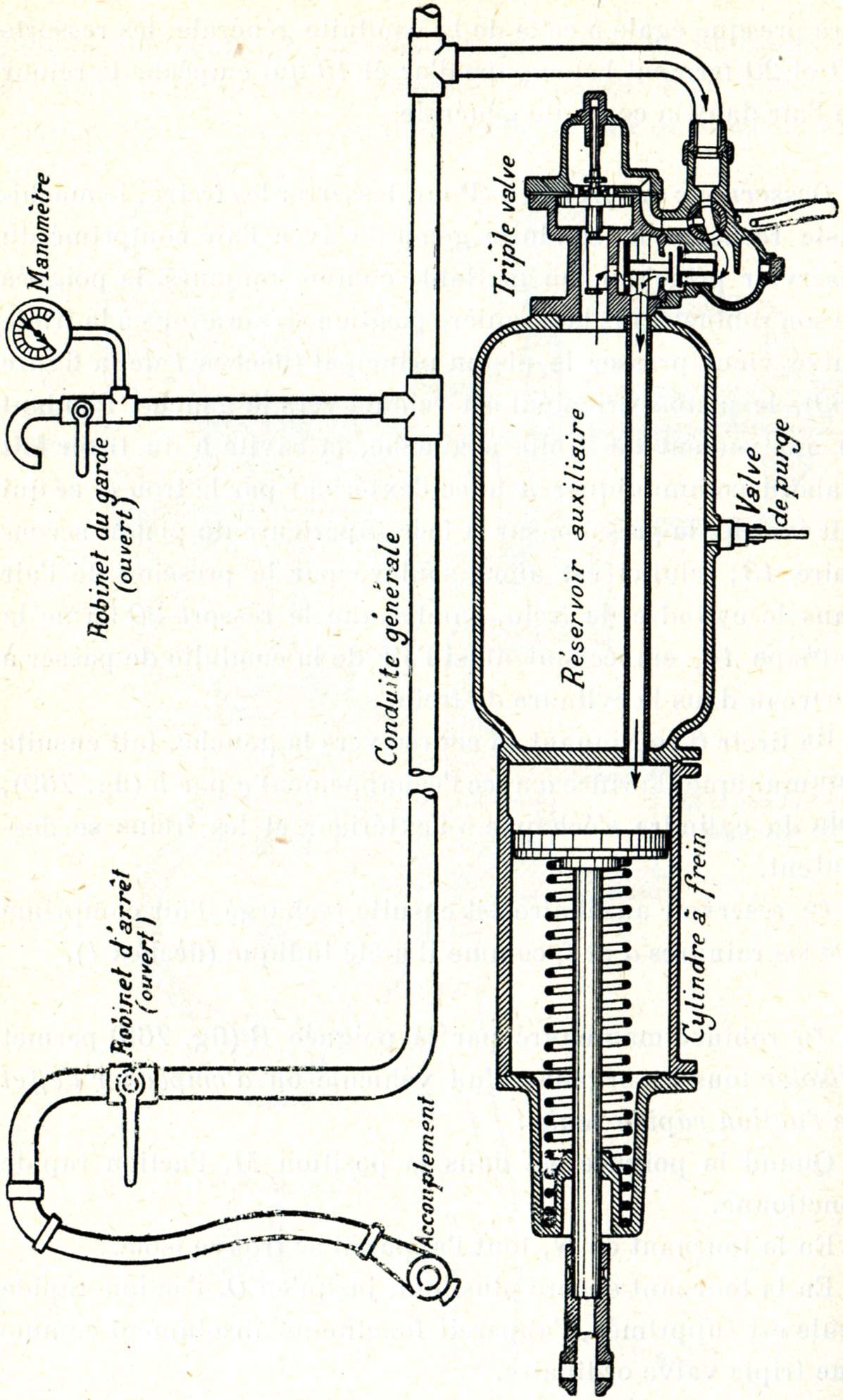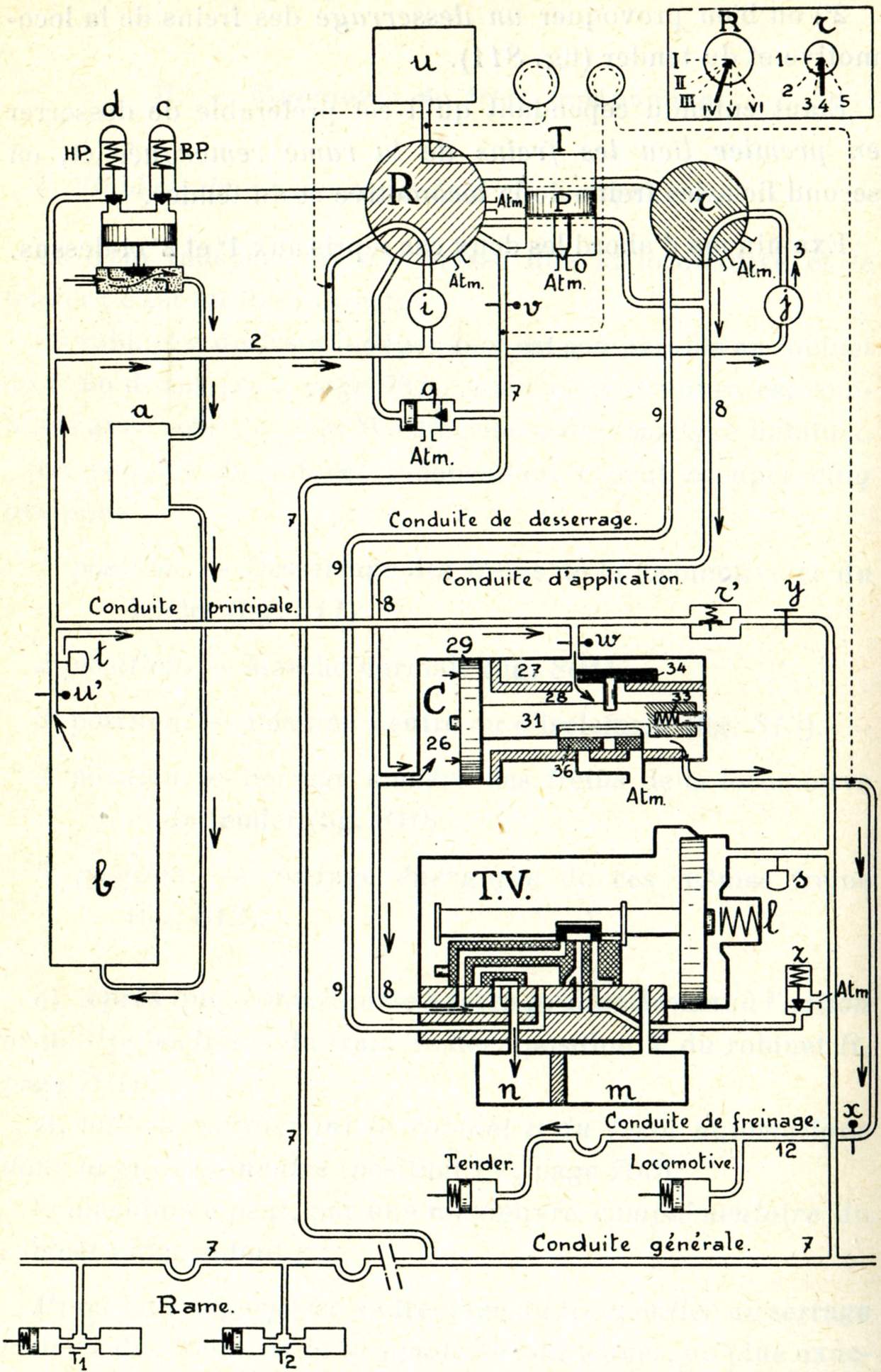 La locomotive porte (fig. 749) une petite pompe à vapeur, appelée compresseur, dénommée communément pompe à air. Cette pompe aspire l'air à l'extérieur et le refoule, en le comprimant à une pression de 8 kg/cm², dans un réservoir placé aussi sur la locomotive et dénommé réservoir principal. Le réservoir principal communique à son tour avec une conduite qui règne sur toute la longueur du train et que l'on nomme pour ce motif conduite générale. Enfin, sous chaque véhicule se trouvent installés : un cylindre appelé cylindre de frein, un petit réservoir dénommé réservoir auxiliaire et un appareil distributeur qui a reçu le nom de triple valve.