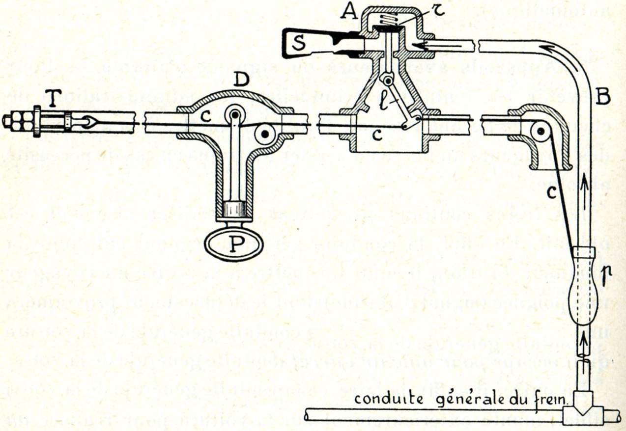 Toutes les boîtes-guides d'une voiture sont reliées à la fois entre elles et à la boite à sifflet par un tube contenant un câble métallique C. Le câble repose sur des poulies, il est fixé par une de ses extrémités au levier de commande l de la soupape r et, par l'autre, au tendeur T de la boîte-guide extrême.