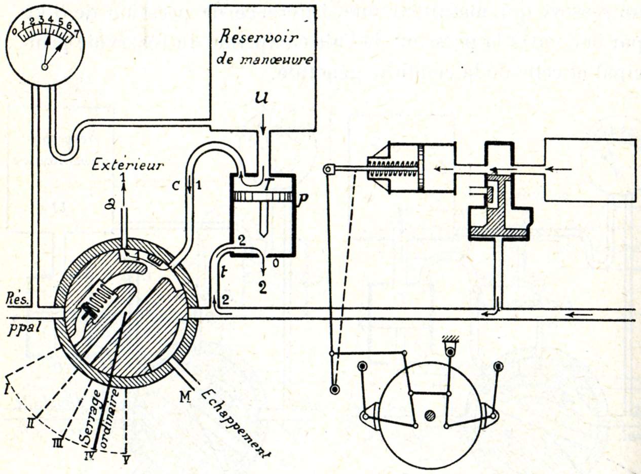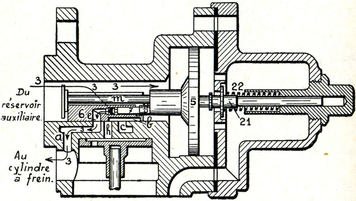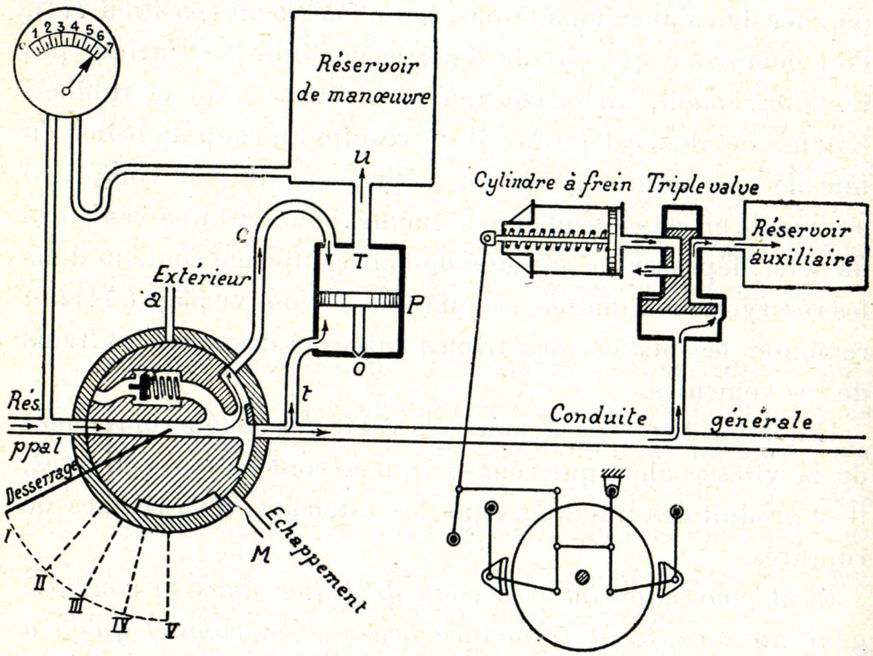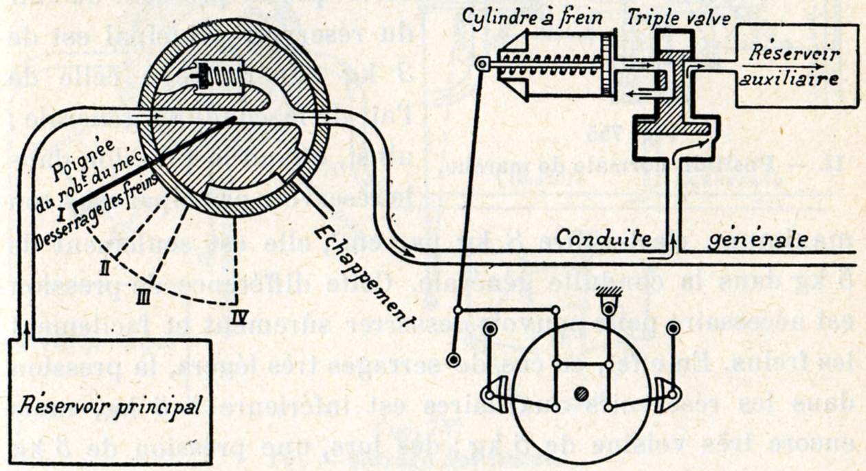 Remarquons aussi que la triple valve est en communication avec la conduite générale, avec le réservoir auxiliaire et avec le cylindre de frein, c'est donc un distributeur à trois voies.