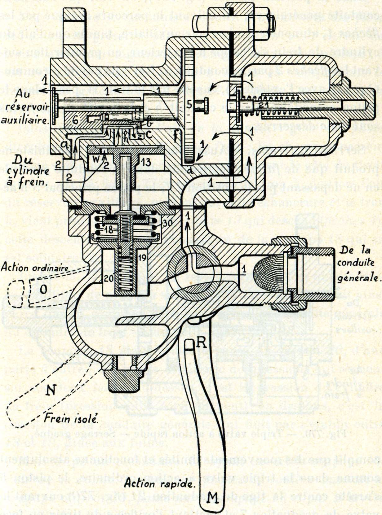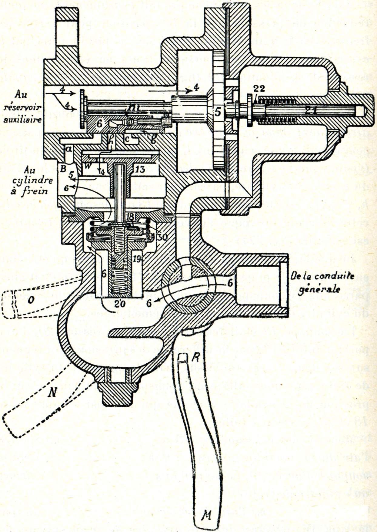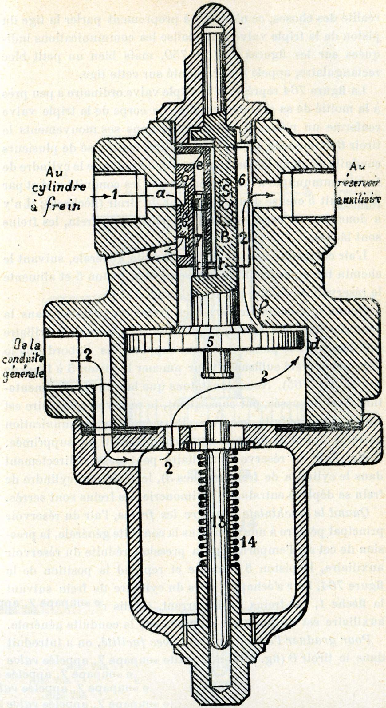 Remarquons aussi que la triple valve est en communication avec la conduite générale, avec le réservoir auxiliaire et avec le cylindre de frein, c'est donc un distributeur à trois voies.