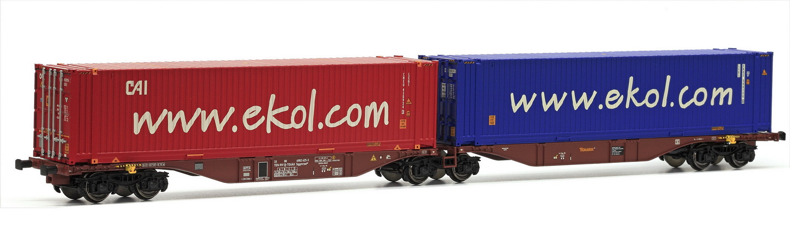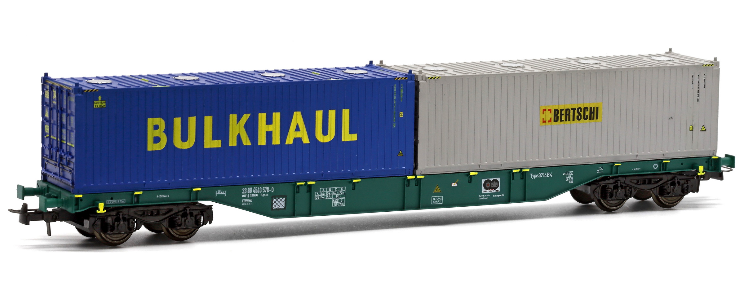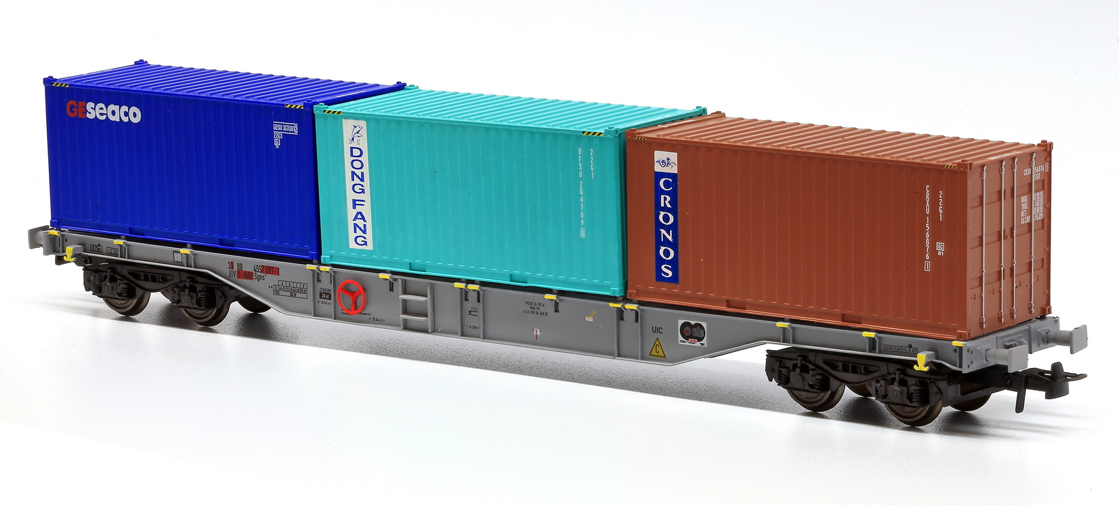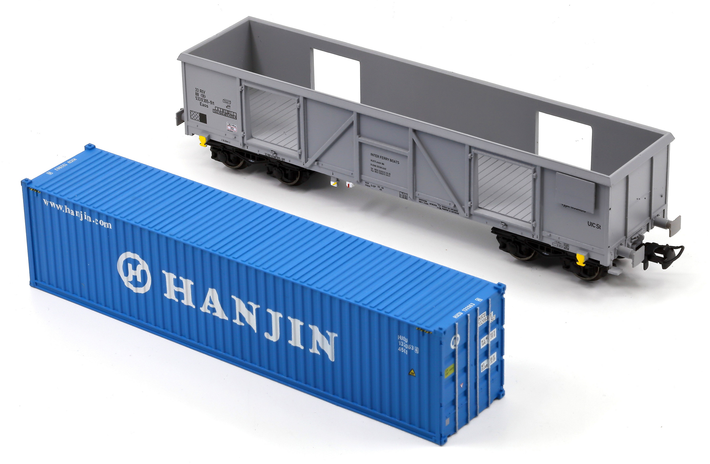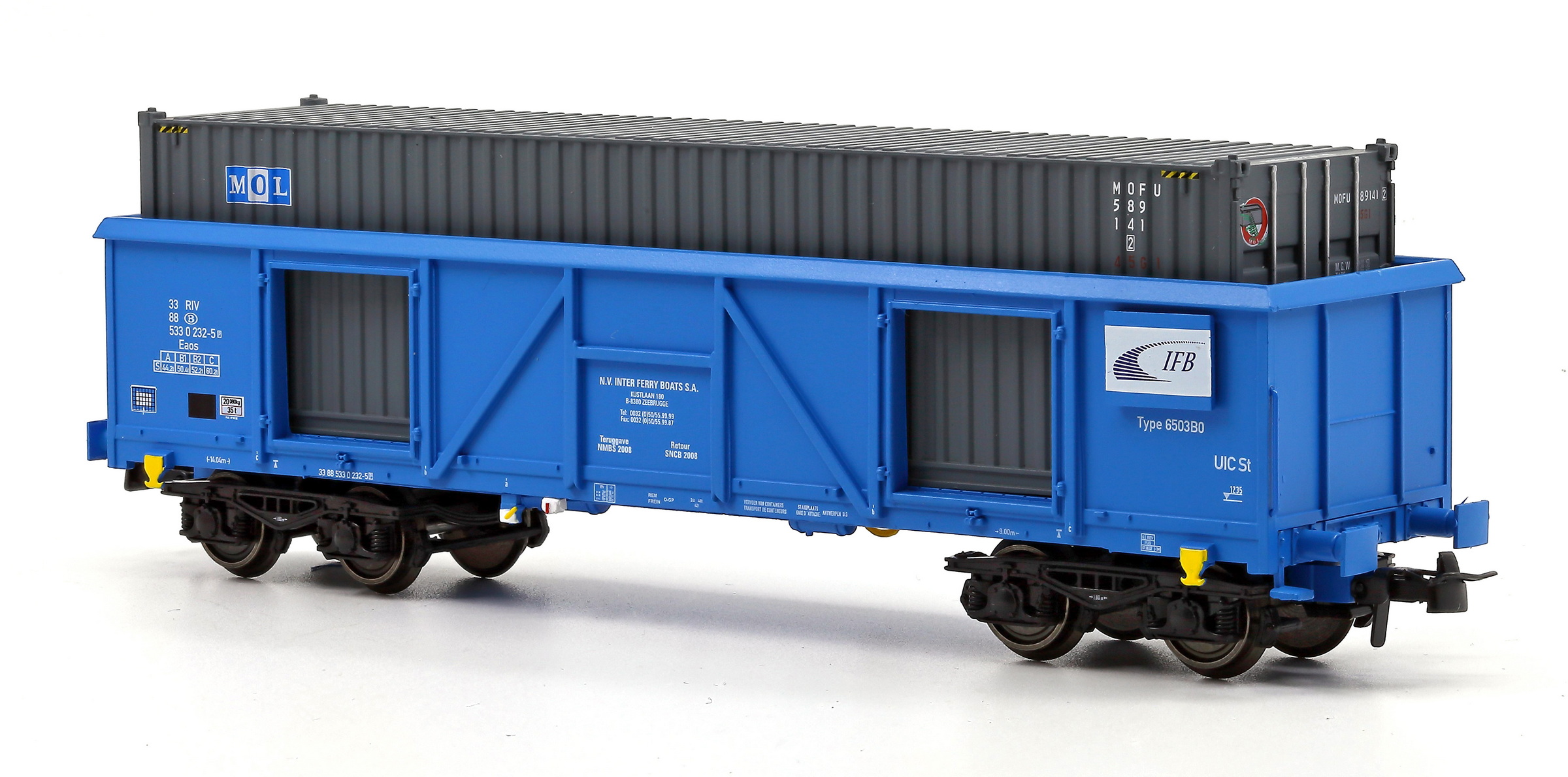 | | | 40.005-02 = 33 88 533 2 409-7, du dépôt de Antwerpen-D.S., wagon tombereau à grande capacité avec 2 bogies à 2 essieux, châssis et bogies noirs, caisse bleue, chargé de conteneurs argent et noir IFB/CHINA SHIPPING", longueur : 16 cm, Ep. IV, DC (upd 13/07/2011) |