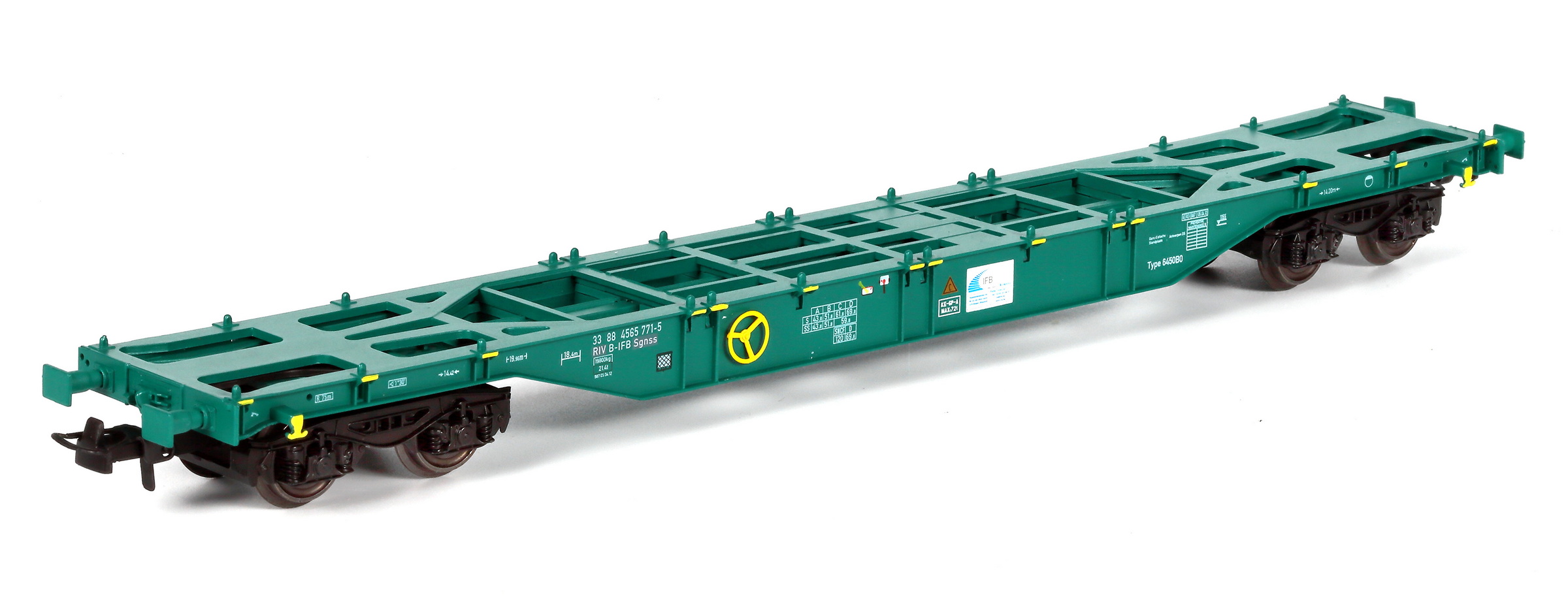 | | | 40.005-01 = 33 88 533 1 220-9, du dépôt de Antwerpen-D.S., wagon tombereau à grande capacité avec 2 bogies à 2 essieux, châssis et bogies noirs, caisse bleue, chargé de conteneurs argent et noir IFB/MAERSK",longueur : 16 cm, Ep. IV, DC (upd 13/07/2011) |