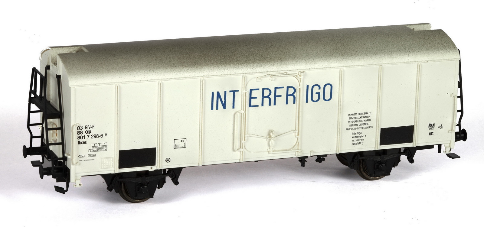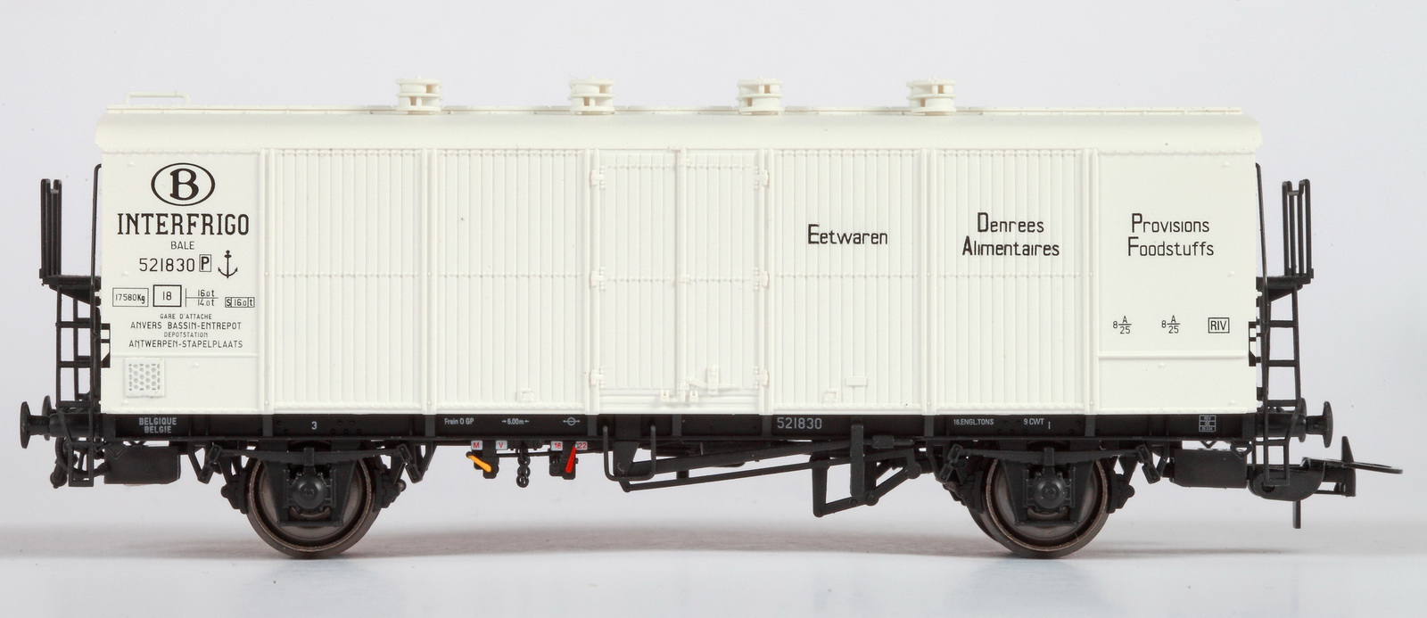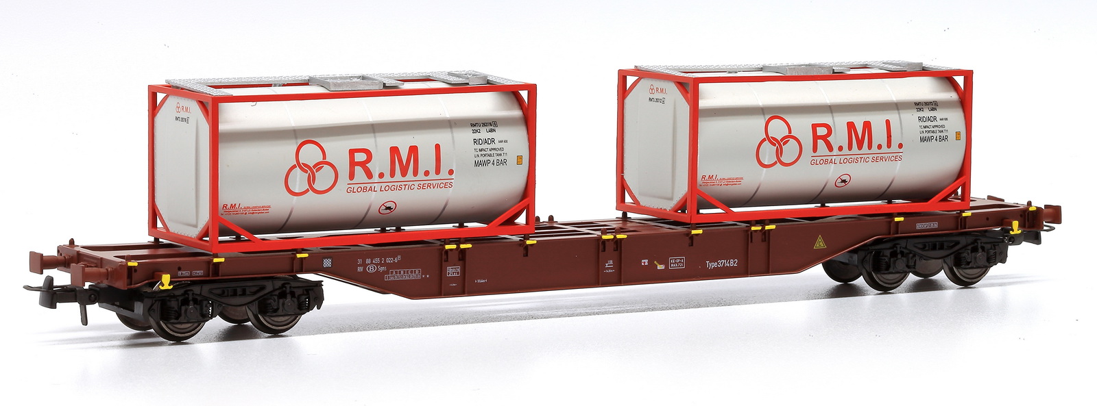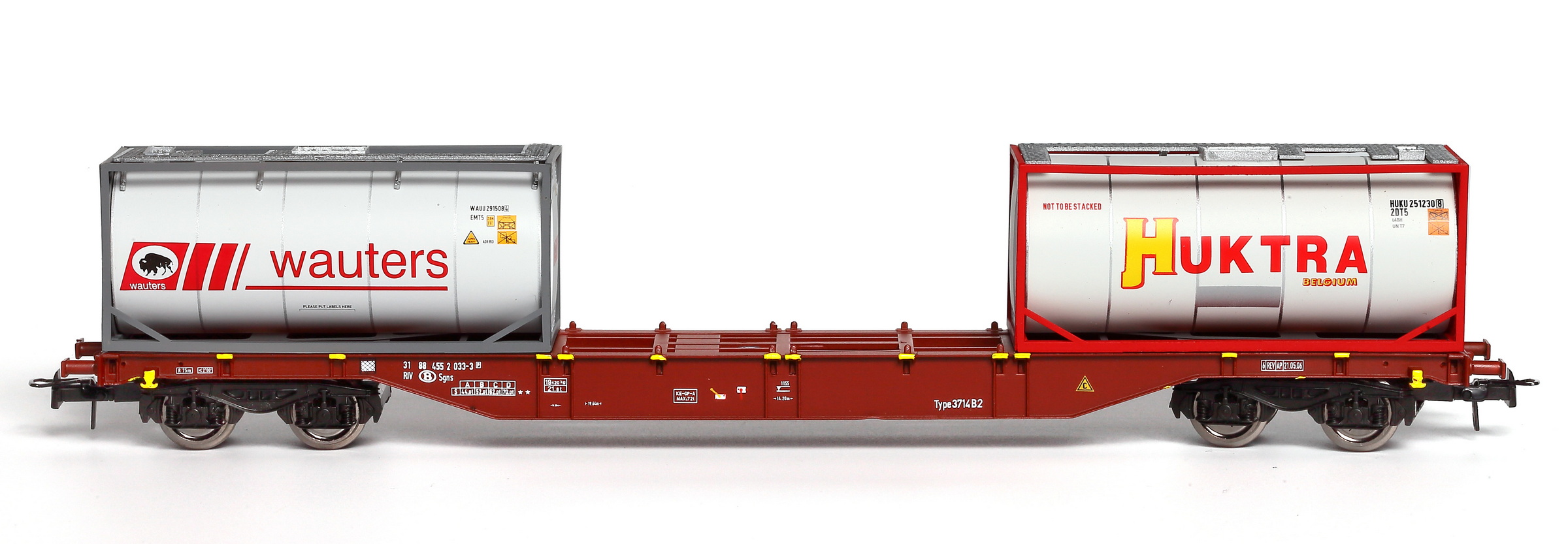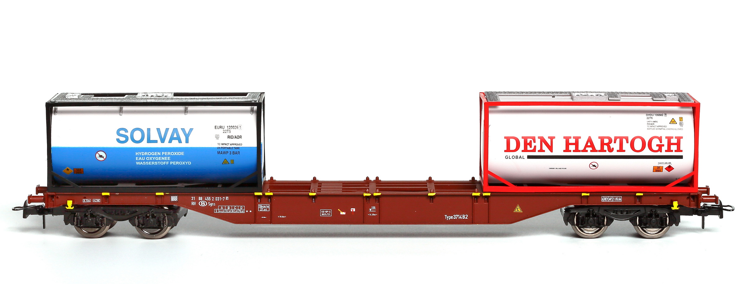 | | | VB-81038-01 de 2019 = 33 88 795 8 118-3, du dépôt de Antwerpen, Type M6757B1, Wagon citerne à 2 bogies de 2 essieux, avec passerelle de serre-freins d'un côté, échelle et demi-passerelle de circulation supérieure, châssis noir, citerne blanche et bleue avec bandeau orange horizontal, marquage "SOLVAY" avec logo en bleu, "NATRONCHEMIE". Passerelle supérieure noire, Ep. V, DC (Note d'authenticité : wagon fictif) (upd 21/03/2019) |