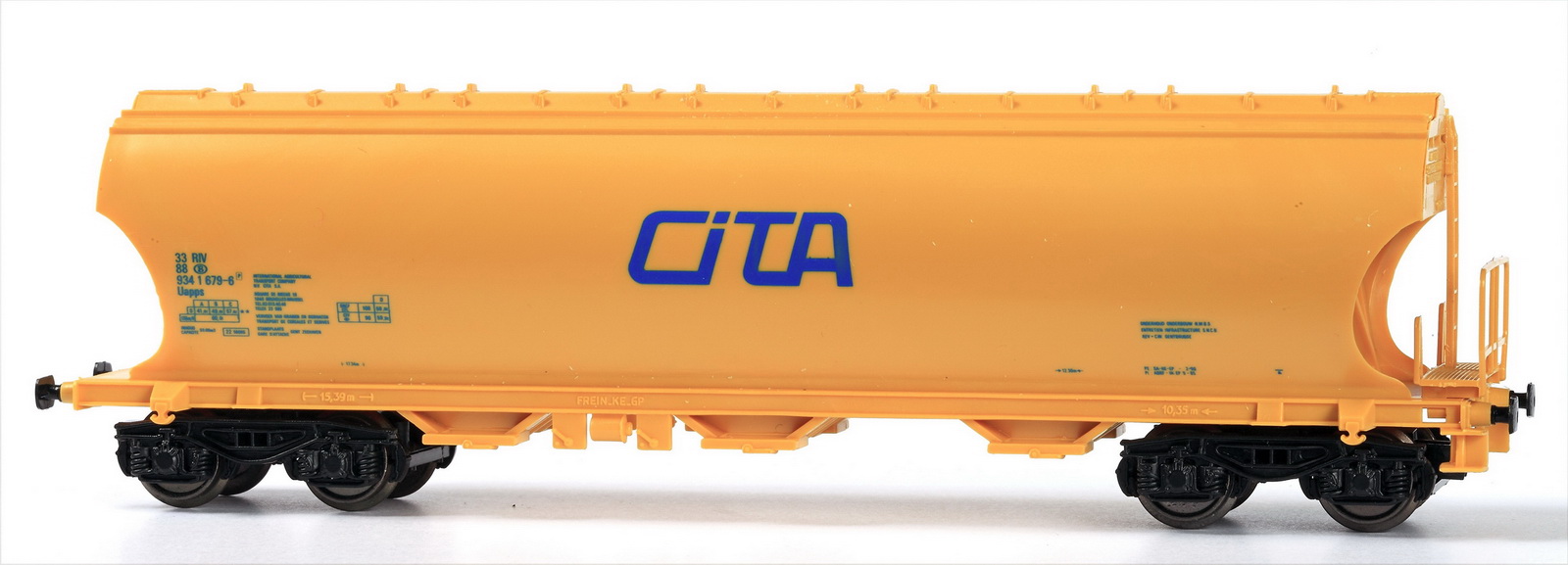 | | | 46342.05 de 2010 = 33 88 934 1 530-1, Wagon céréalier muni de 2 bogies de 2 essieux, châssis blanc, silo blanc avec marquage "CITA" dans une petite cartouche jaune. Dans un coffret de 5 # 46342, Ep. IV, AC (upd 10/07/2014) |