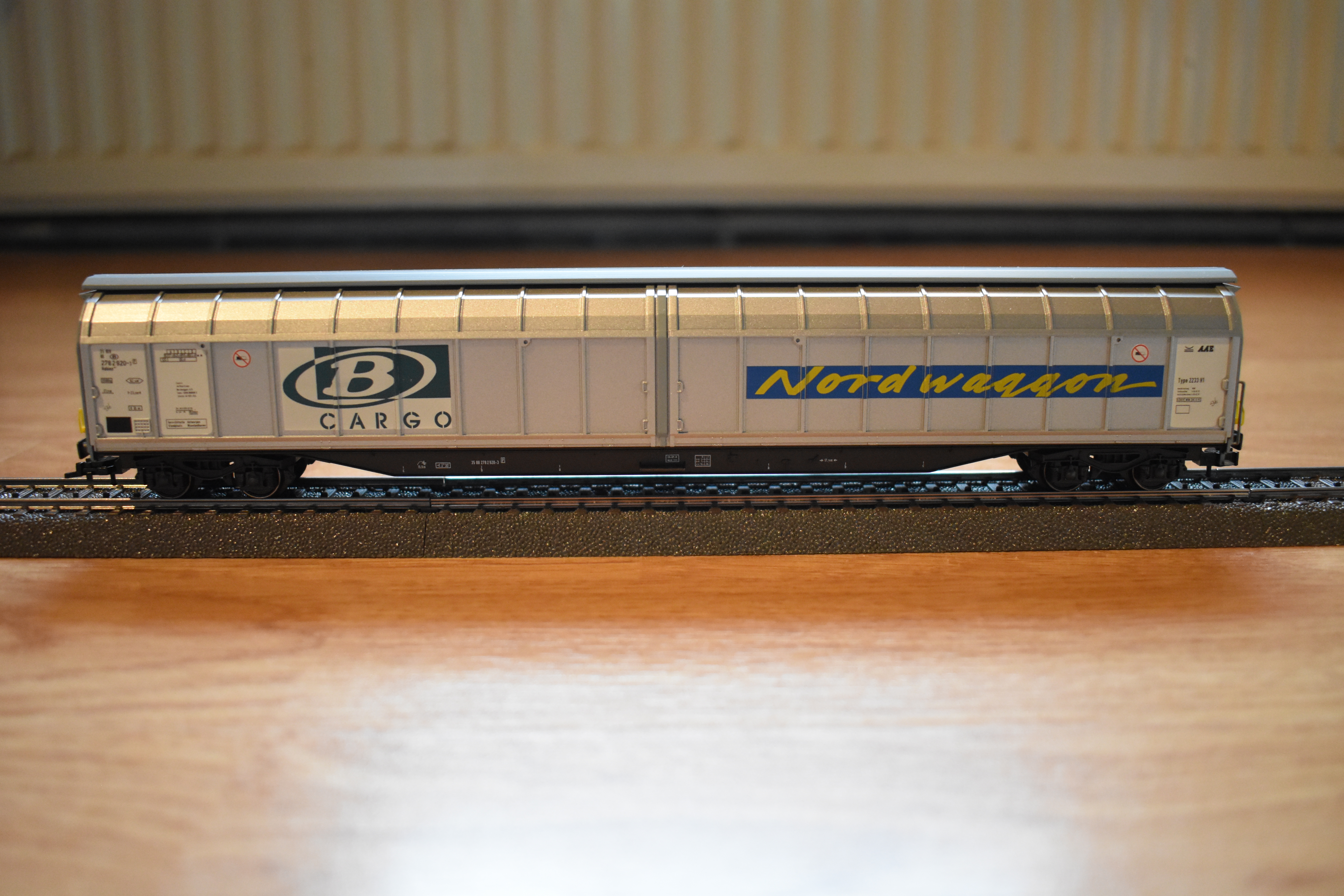 | | | VB-84001-01 de 2014 = 80 88 982 0 962-8, Wagon trémie à bogies pour le ballast, livrée brune, boîtes à essieu bleues. Chargement de ballast, Ep. V, DC (upd 11/12/2014) |