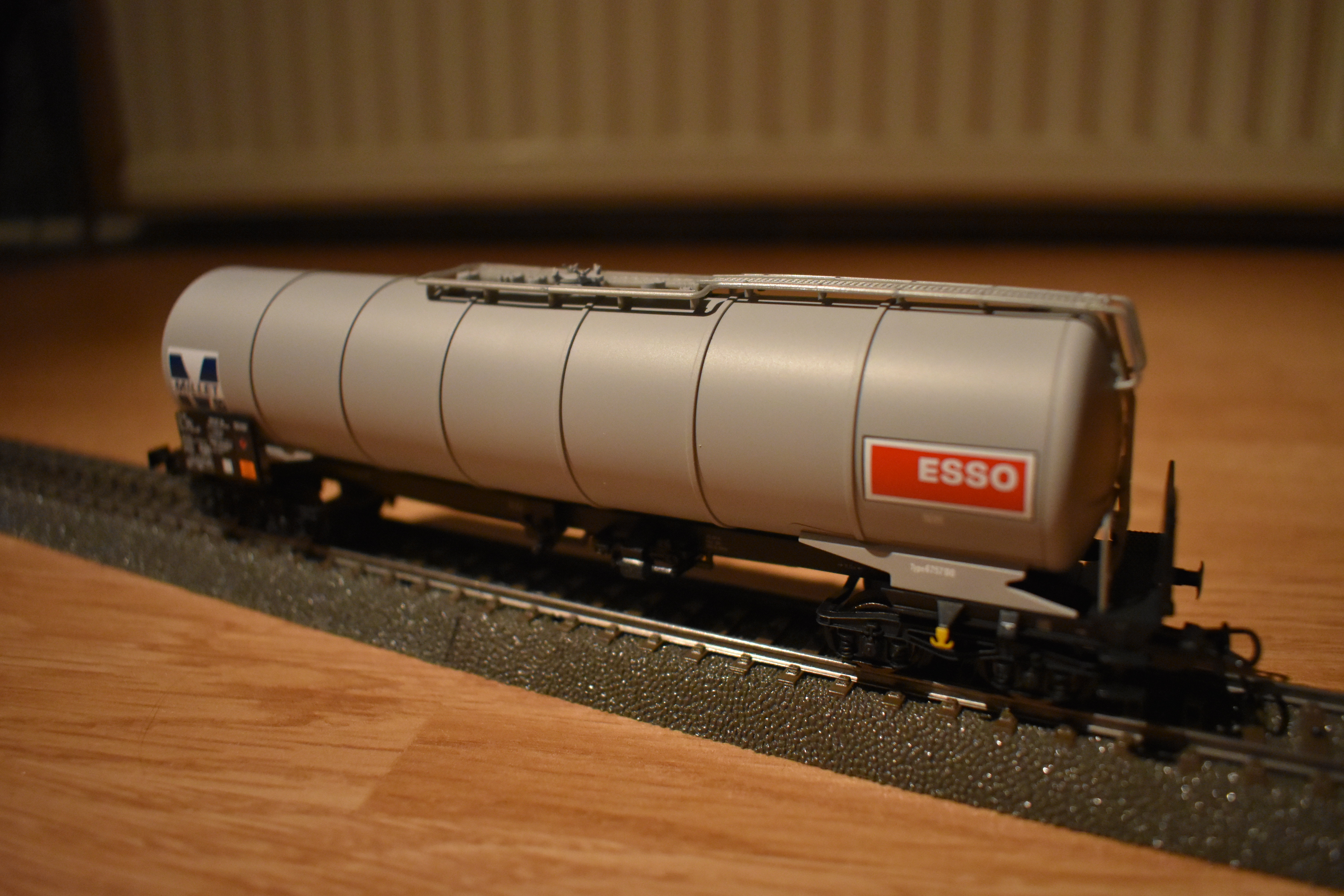 | | | VB-81087-01 de 2024 = , Wagon citerne à 2 bogies de 2 essieux, avec passerelle de serre-freins d'un côté, échelle et demi-passerelle de circulation supérieure, châssis noir, citerne grise, marquage "MILLET" et "ESSO", Ep. IV, DC (upd 03/02/2024) |