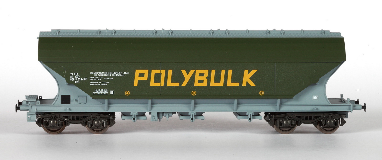 | | | VB-84010-02 de 2020 = 80 88 982 0 937-0 B-Infrabel, Type 9820A4, wagon trémie à bogies pour le ballast, livrée brune, boîtes à essieu bleues. Infrabel. Chargement de ballast, Ep. VI, DC (upd 09/01/2021) |