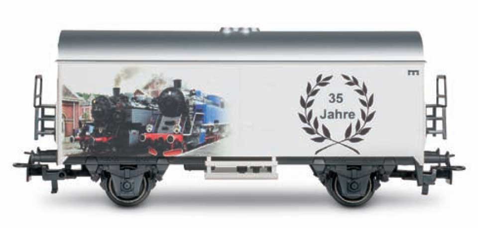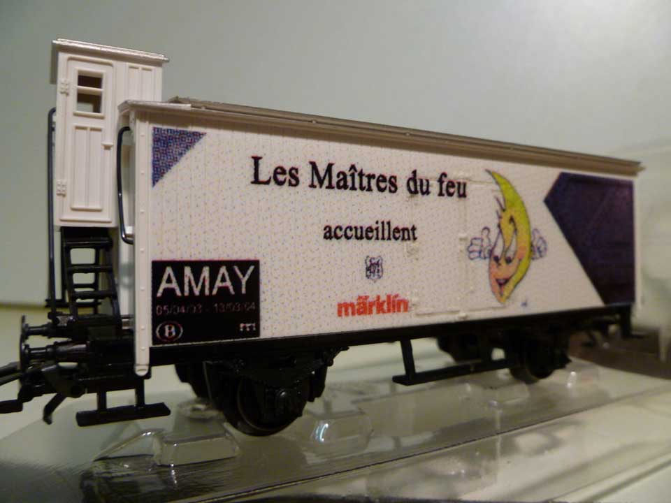 | | | de 2001 = 60502, wagon porte-container à 2 essieux, châssis noir, container doré avec inscription noire "GODIVA CHOCOLATIER". Les invendus ont reçus sur le toit la mention "TRAINCITY - Pier - Blankenberge", 100 exemplaires (upd 24/01/2012) |
