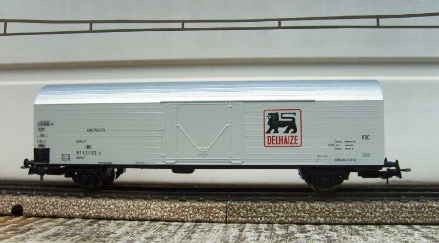 | | | 87735 de 1987 = DELU 00 87 14, Wagon porte-container à 2 essieux, châssis noir, container blanc et lignes orange/brun avec inscription "DELHAIZE". A été repris dans le coffret Delhaize set A, 1000 exemplaires, AC (upd 01/07/2011) |