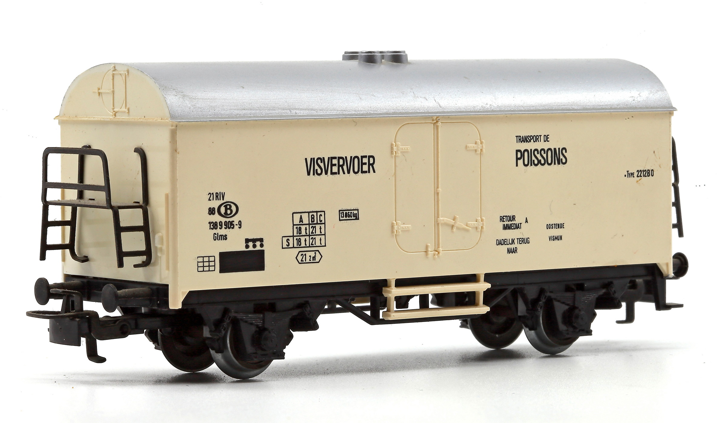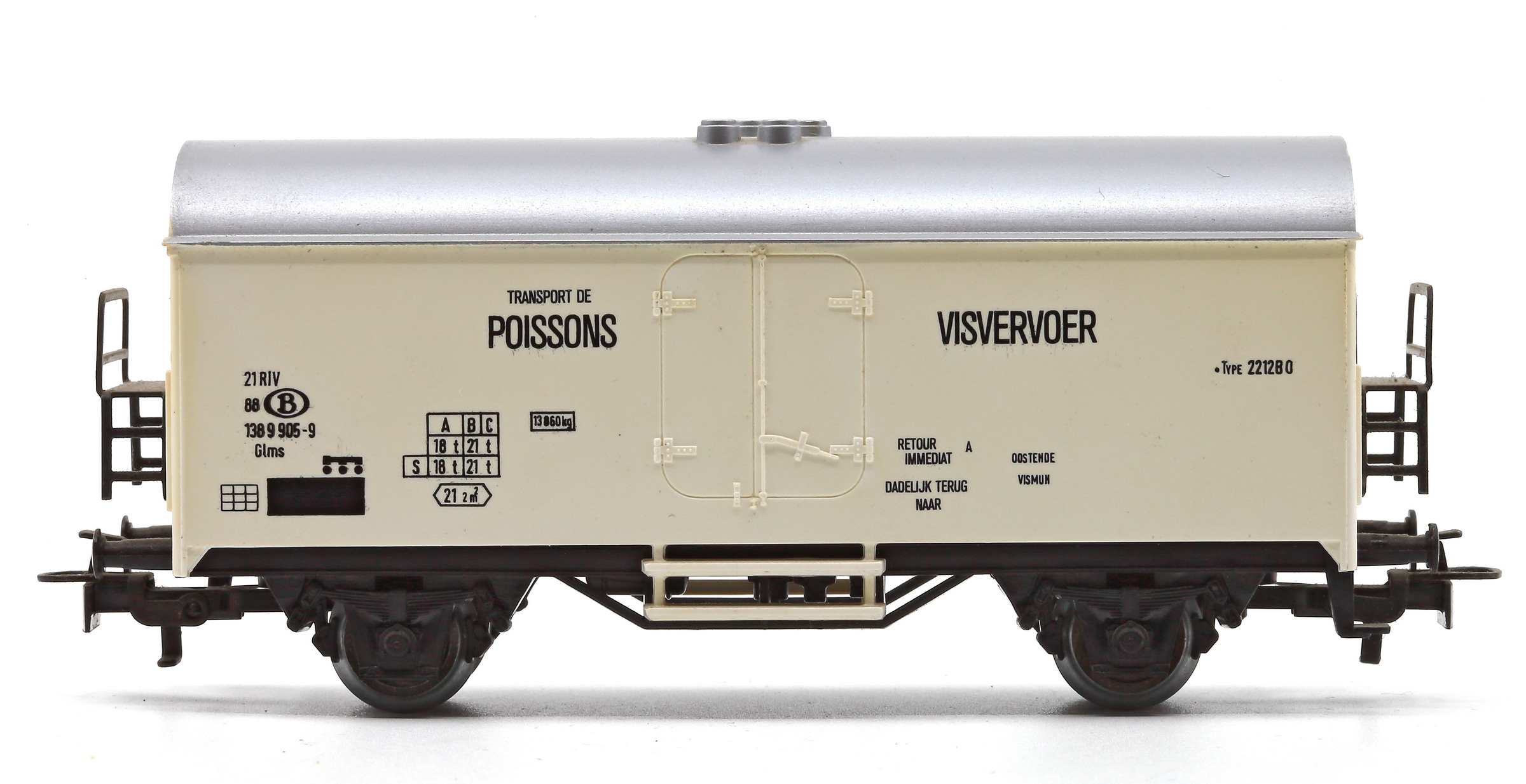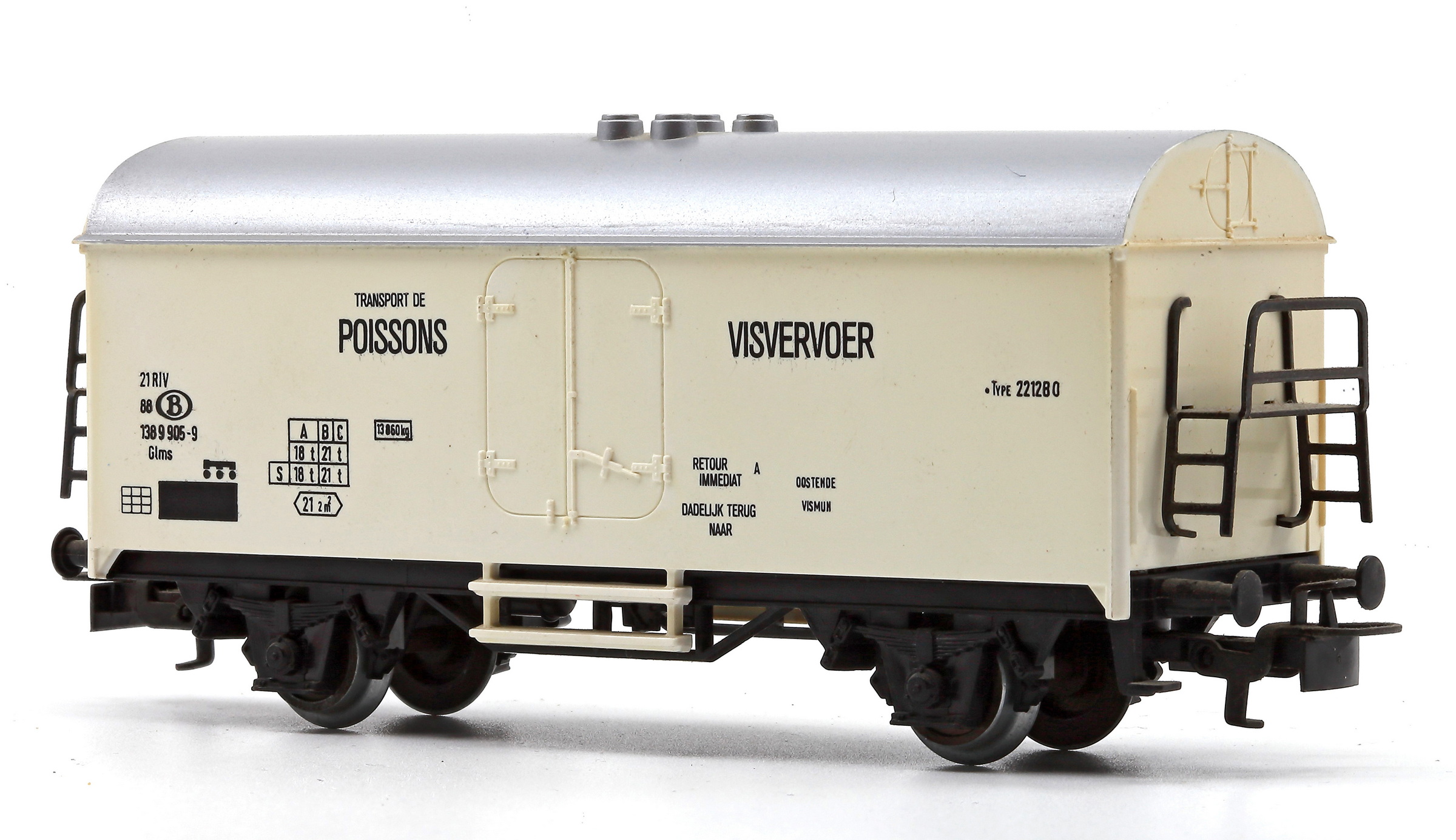 | | | 84705 de 1984 = 21 88 802 1 057-8, du dépôt de Oostende Zeehaven, Type Ibdes, Wagon frigorifique métallique à 2 essieux, caisse blanche avec inscription bleu "Visvervoer - Transport de poisson", 500 exemplaires, AC (upd 24/03/2025) |