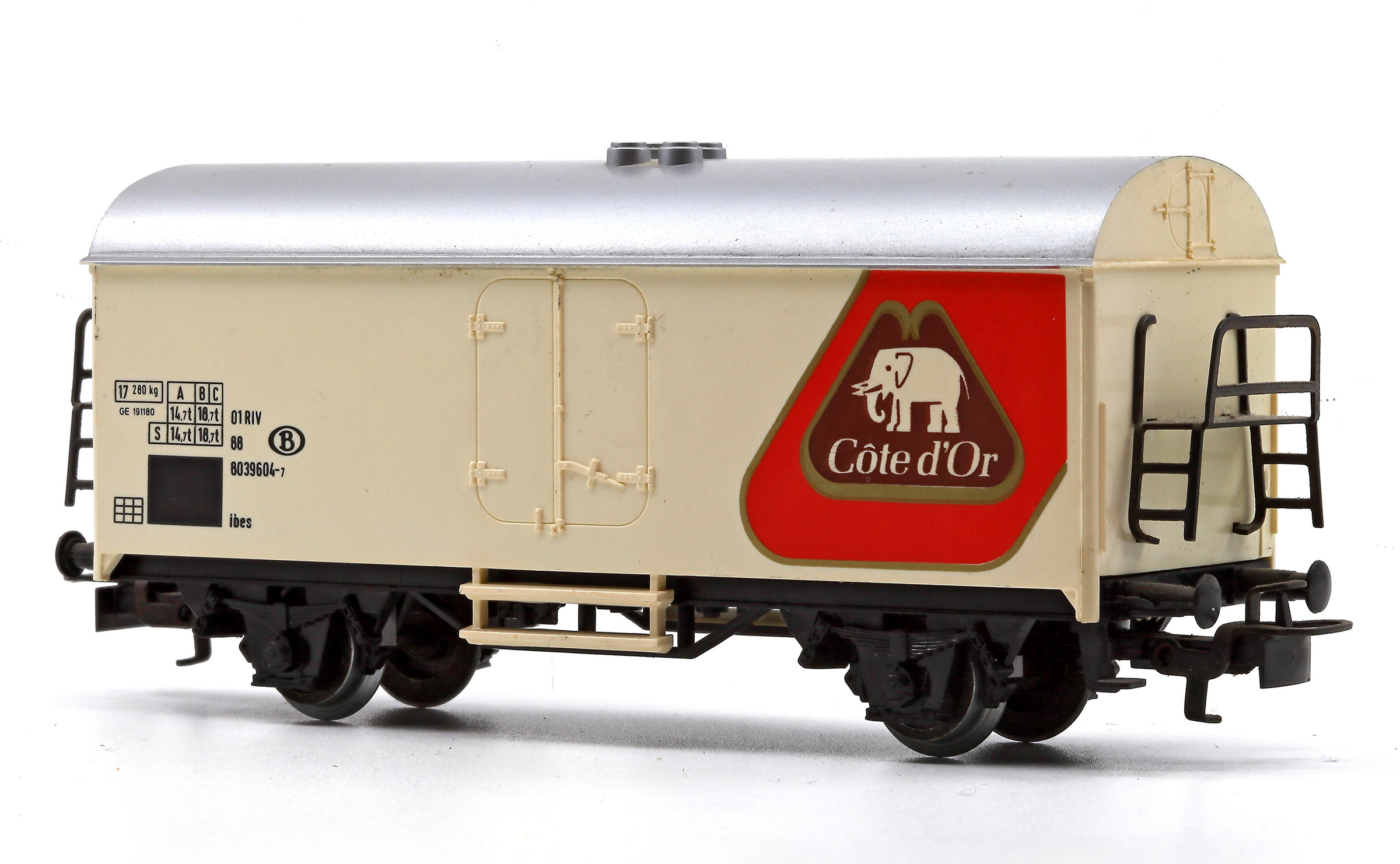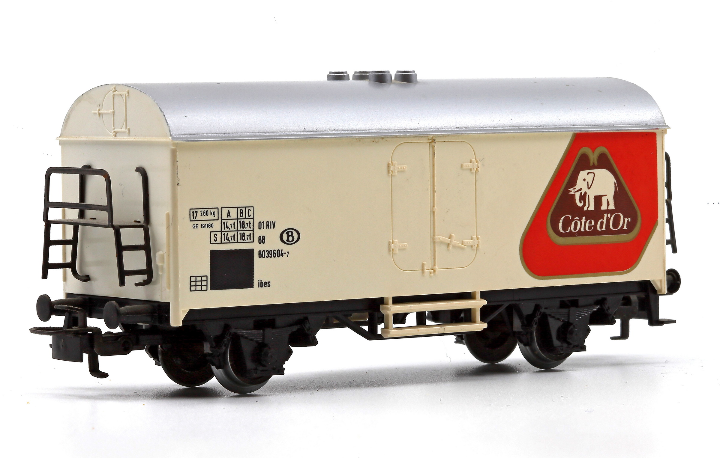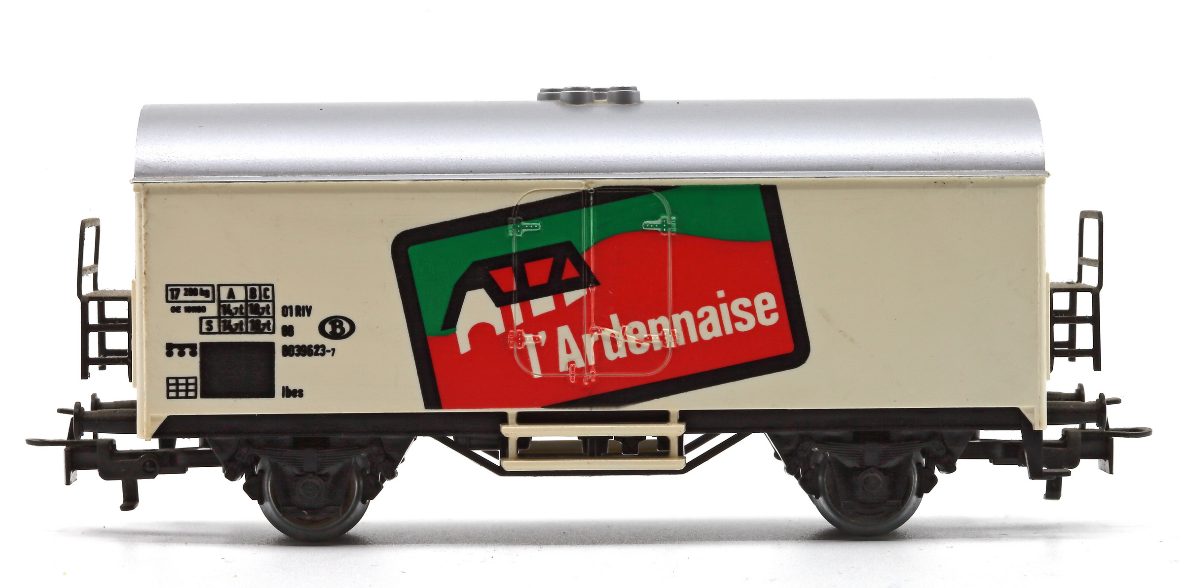 | | | 4415.041 = , Wagon frigorifique, livrée blanche, toit argenté, marquage "Speelgoedmuseum Mechelen", AC (Note d'authenticité : La même décoration existe sur un wagon Fleischmann (5320) avec une immatriculation DB : 21 80 841 3 024-2) (upd 11/07/2014) |