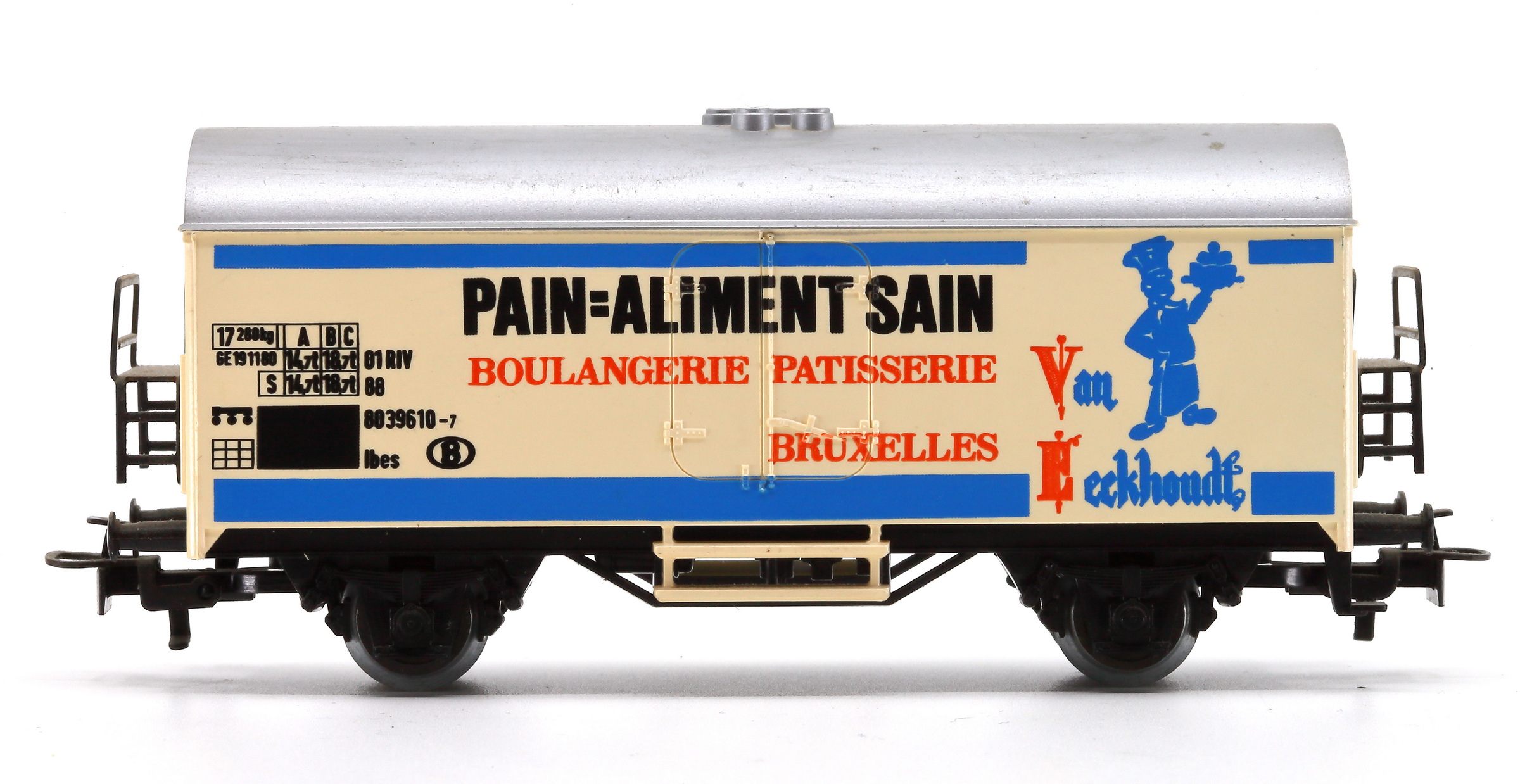 | | | 84709 de 1984 = 01 88 803 9 610-7, Type Ibes, Wagon frigorifique, livrée blanche, toit argenté, marquage "Pain = aliment sain (en bleu), Boulangerie Pâtisserie Van Eeckhoudt Bruxelles - Brood en banketbakkerij Brussel" en orange, 600 exemplaires, AC (upd 24/03/2025) |