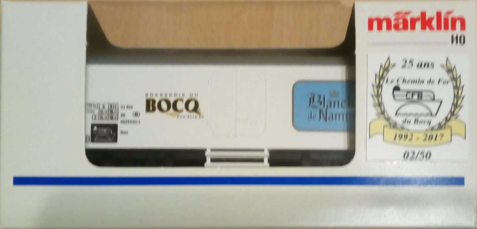| | | de 2017 = 01 88 802 5 530-1, Wagon frigorifique, livrée blanche, toit gris, marquage "Brasserie du Bocq" en noir, sigle "Blanche de Namur", 50 exemplaires, AC (upd 06/11/2017) |