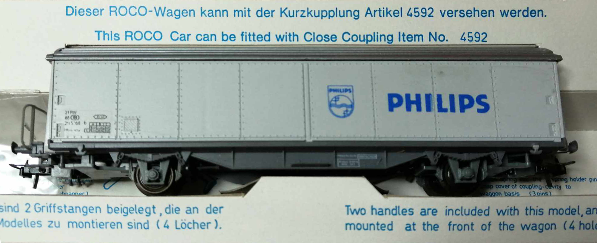 | | | 4340 D = 21 88 211 5 168-6, Wagon couvert à deux essieux, caisse blanche, inscription et sigle bleus "Philips", Ep. IV, DC (upd 19/03/2024) |
