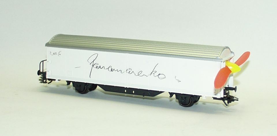 | | | de 1985 = 11 80 806 2 274-9, Type Ichqrs, Wagon frigo à deux essieux avec passerelle de serre-freins, caisse blanche, toit argenté, inscription noir et rouge "Smalfilmstudio", AC (Note d'authenticité : Wagon allemand) (upd 24/03/2025) |
