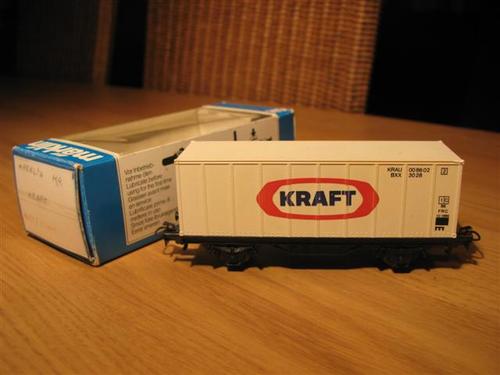 | | | 86708 de 1986 = KRAU 00 86 02, wagon porte-container à 2 essieux, châssis noir, container blanc avec inscription bleu et rouge "KRAFT", 500 exemplaires, AC (upd 15/04/2012) |