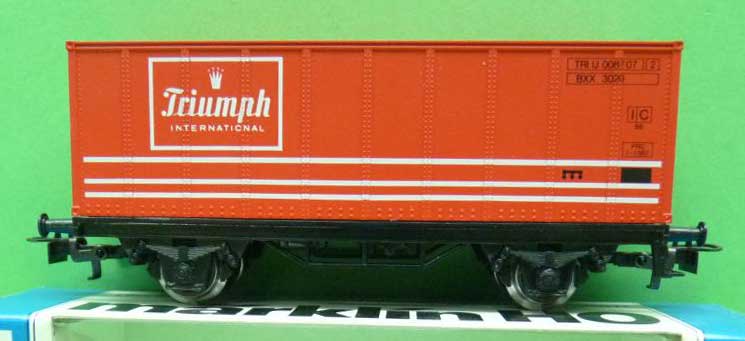 | | | 87730 de 1987 = TRIU 00 87 07, wagon porte-container à 2 essieux, châssis noir, container rouge + inscription blanche "TRIUMPH INTERNATIONAL", 500 exemplaires, AC (upd 16/01/2012) |