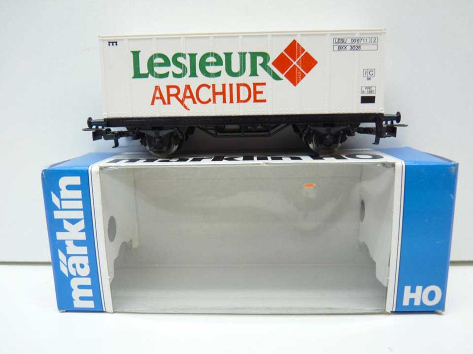 | | | 87731 de 1987 = LESU 00 87 11, wagon porte-container à 2 essieux, châssis noir, container blanc avec inscription vert/rouge "LESIEUR ARACHIDE", 500 exemplaires, AC (upd 24/10/2011) |