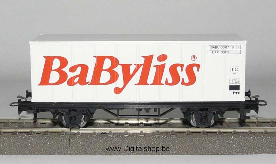 | | | 88727 de 1988 = BABU 00 87 19, wagon porte-container à 2 essieux, châssis noir, container blanc avec inscription rouge "BABYLISS", 500 exemplaires, AC (upd 01/07/2011) |